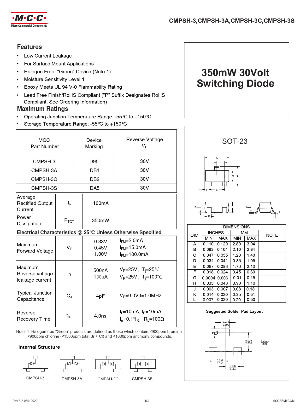 • Operating Junction Temperature Range: -55°C to +150°C • Storage Temperature Range: -55°C to +150°C MCC Device Reverse Voltage SOT-23 Part Number Marking VR A CMPSH-3 D95 30V D CMPSH-3A DB1 30V C B CMPSH-3C DB2 30V CMPSH-3S DA5 30V F E Average Rectified Output Io 100mA G H J Current L Power K P Dissipation TOT 350mW DIMENSIONS
