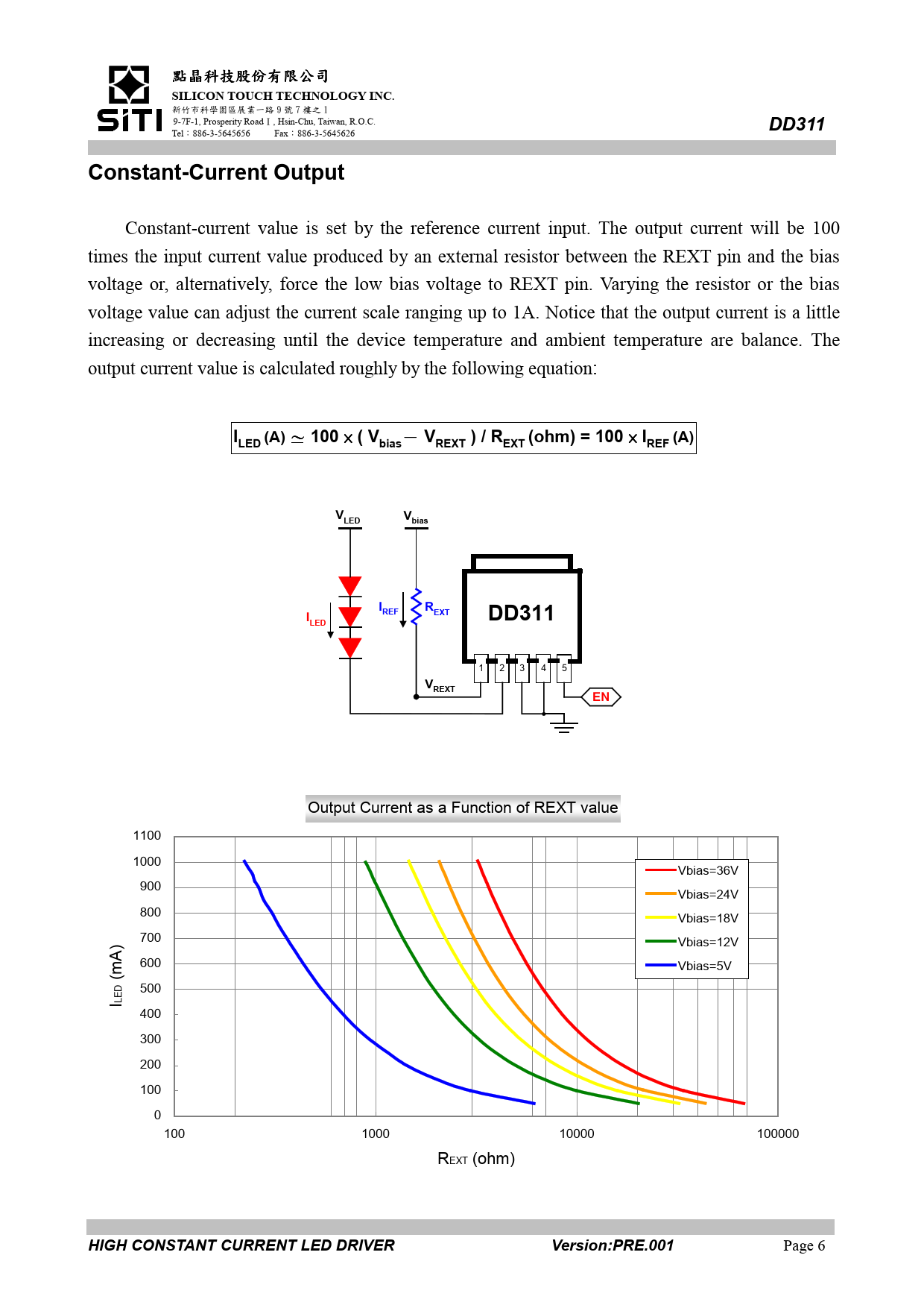 SILICON TOUCH TECHNOLOGY INC. DD311. Constant-Current Output. (A). ) / R. (ohm) = 100. LED. 100. ( Vbias. REXT. EXT. REF. bias. ILED. VREXT