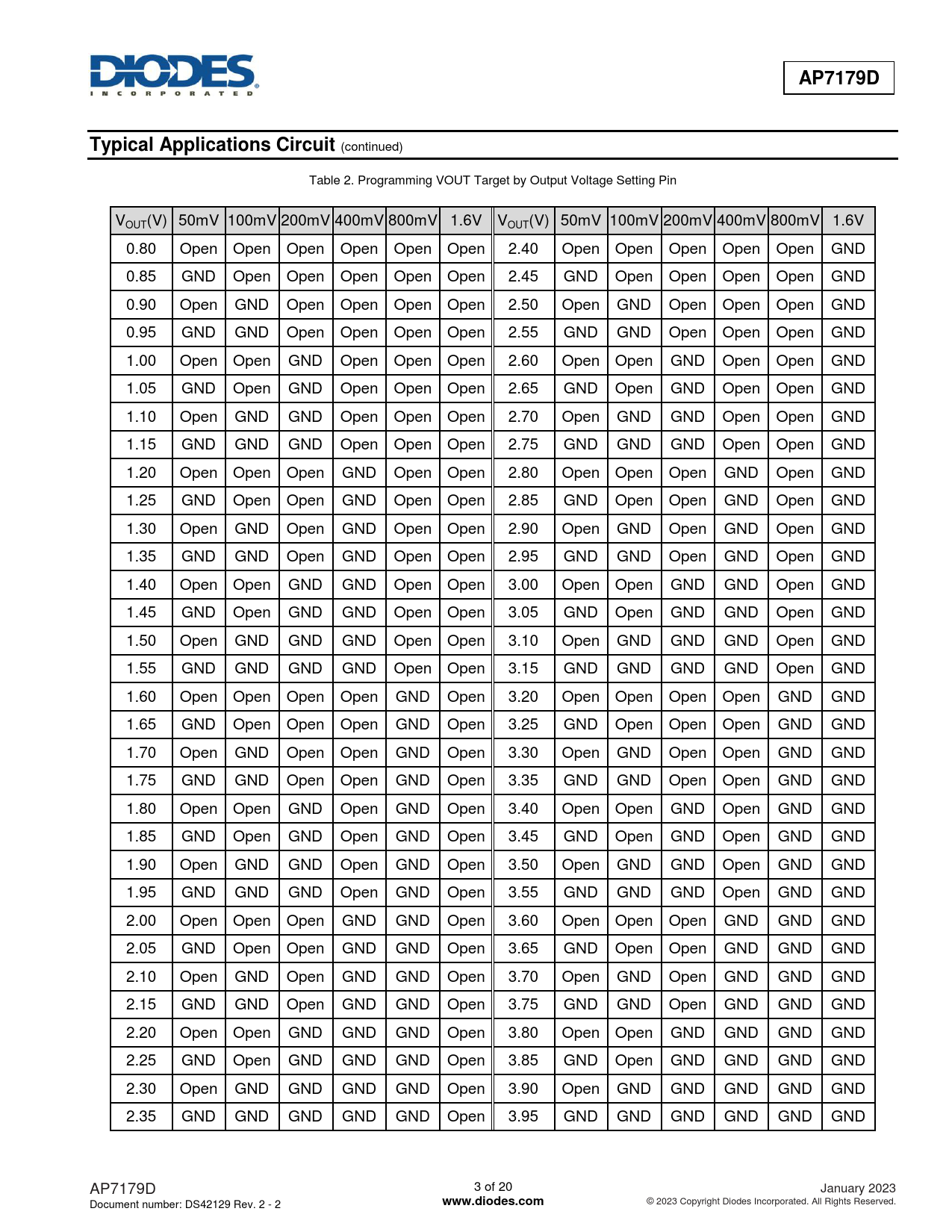 (continued) Table 2. Programming VOUT Target by Output Voltage Setting Pin VOUT(V) 50mV 100mV 200mV 400mV 800mV 1.6V VOUT(V) 50mV 100mV 200mV 400mV 800mV 1.6V 0.80 Open Open Open Open Open Open 2.40 Open Open Open Open Open GND 0.85 GND Open Open Open Open Open 2.45 GND Open Open Open Open GND 0.90 Open GND Open Open Open Open 2.50 Open GND Open Open Open GND 0.95 GND GND Open Open Open Open 2.55 GND GND Open Open Open GND 1.00 Open Open GND Open Open Open 2.60 Open Open GND Open Open GND 1.05 GND Open GND Open Open Open 2.65 GND Open GND Open Open GND 1.10 Open GND GND Open Open Open 2.70 Open GND GND Open Open GND 1.15 GND GND GND Open Open Open 2.75 GND GND GND Open Open GND 1.20 Open Open Open GND Open Open 2.80 Open Open Open GND Open GND 1.25 GND Open Open GND Open Open 2.85 GND Open Open GND Open GND 1.30 Open GND Open GND Open Open 2.90 Open GND Open GND Open GND 1.35 GND GND Open GND Open Open 2.95 GND GND Open GND Open GND 1.40 Open Open GND GND Open Open 3.00 Open Open GND GND Open GND 1.45 GND Open GND GND Open Open 3.05 GND Open GND GND Open GND 1.50 Open GND GND GND Open Open 3.10 Open GND GND GND Open GND 1.55 GND GND GND GND Open Open 3.15 GND GND GND GND Open GND 1.60 Open Open Open Open GND Open 3.20 Open Open Open Open GND GND 1.65 GND Open Open Open GND Open 3.25 GND Open Open Open GND GND 1.70 Open GND Open Open GND Open 3.30 Open GND Open Open GND GND 1.75 GND GND Open Open GND Open 3.35 GND GND Open Open GND GND 1.80 Open Open GND Open GND Open 3.40 Open Open GND Open GND GND 1.85 GND Open GND Open GND Open 3.45 GND Open GND Open GND GND 1.90 Open GND GND Open GND Open 3.50 Open GND GND Open GND GND 1.95 GND GND GND Open GND Open 3.55 GND GND GND Open GND GND 2.00 Open Open Open GND GND Open 3.60 Open Open Open GND GND GND 2.05 GND Open Open GND GND Open 3.65 GND Open Open GND GND GND 2.10 Open GND Open GND GND Open 3.70 Open GND Open GND GND GND 2.15 GND GND Open GND GND Open 3.75 GND GND Open GND GND GND 2.20 Open Open GND GND GND Open 3.80 Open Open GND GND GND GND 2.25 GND Open GND GND GND Open 3.85 GND Open GND GND GND GND 2.30 Open GND GND GND GND Open 3.90 Open GND GND GND GND GND 2.35 GND GND GND GND GND Open 3.95 GND GND GND GND GND GND AP7179D 3 of 20 January 2023 Document number: DS42129 Rev. 2 - 2