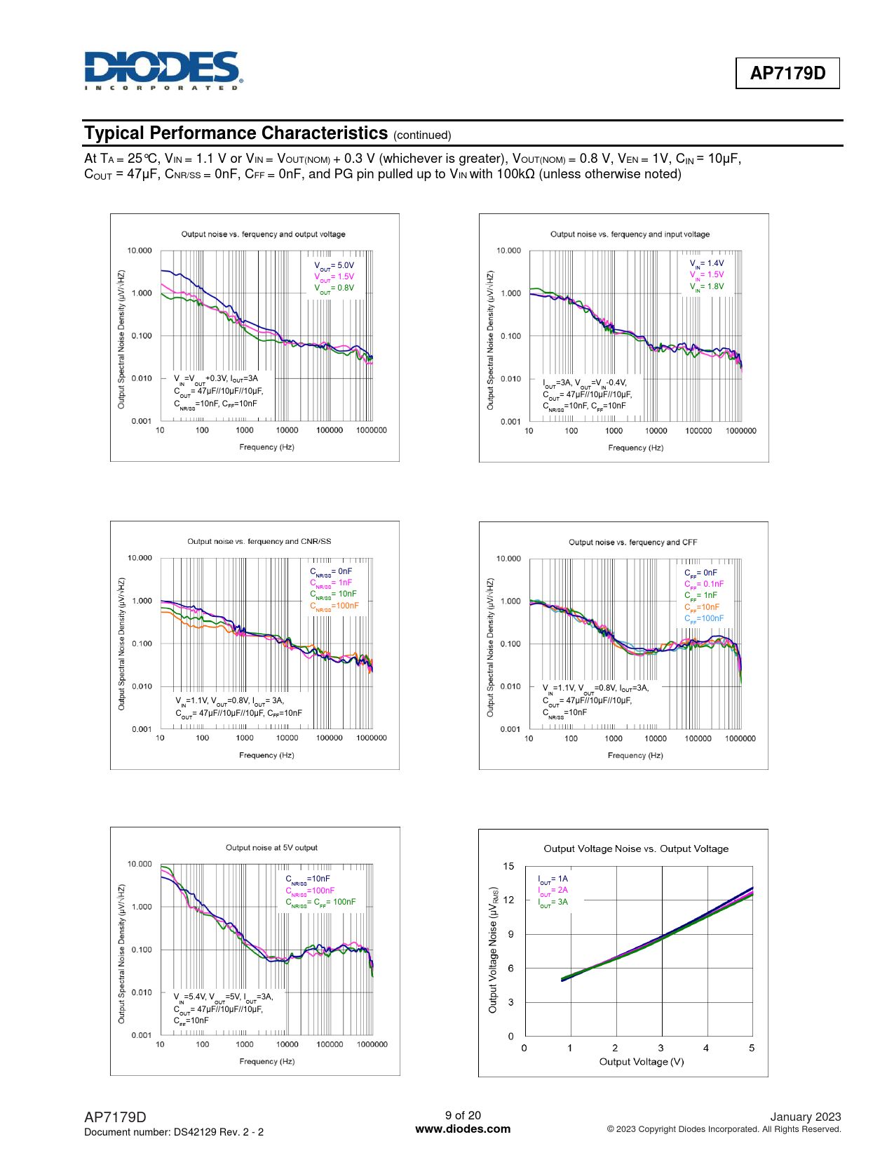 (continued) At TA = 25°C, VIN = 1.1 V or VIN = VOUT(NOM) + 0.3 V (whichever is greater), VOUT(NOM) = 0.8 V, VEN = 1V, CIN = 10μF, COUT = 47μF, CNR/SS = 0nF, CFF = 0nF, and PG pin pulled up to VIN with 100kΩ (unless otherwise noted) V = 1.4V V = 5.0V OUT IN V = 1.5V V = 1.5V OUT IN V = 0.8V V = 1.8V OUT IN V =V +0.3V, IOUT=3A IN OUT I =3A, V =V -0.4V, C = 47μF//10μF//10μF, OUT OUT IN OUT C = 47μF//10μF//10μF, C =10nF, C OUT FF=10nF C =10nF, C =10nF NR/SS NR/SS FF C = 0nF C = 0nF NR/SS FF C = 1nF C = 0.1nF NR/SS FF C = 10nF C = 1nF NR/SS FF C =100nF C =10nF NR/SS FF C =100nF FF V =1.1V, V =0.8V, IOUT=3A, IN OUT V =1.1V, V =0.8V, I = 3A, C = 47μF//10μF//10μF, IN OUT OUT OUT C = 47μF//10μF//10μF, C C =10nF OUT FF=10nF NR/SS C =10nF I = 1A NR/SS OUT C =100nF I = 2A NR/SS OUT C = C = 100nF I = 3A NR/SS FF OUT V =5.4V, V =5V, I =3A, IN OUT OUT C = 47μF//10μF//10μF, OUT C =10nF FF AP7179D 9 of 20 January 2023 Document number: DS42129 Rev. 2 - 2