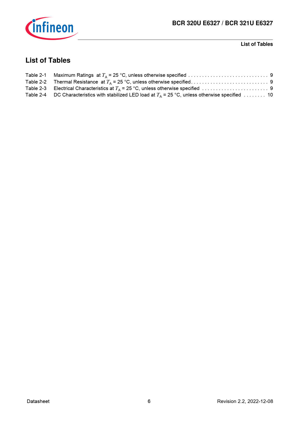BCR 320U E6327 / BCR 321U E6327. List of Tables