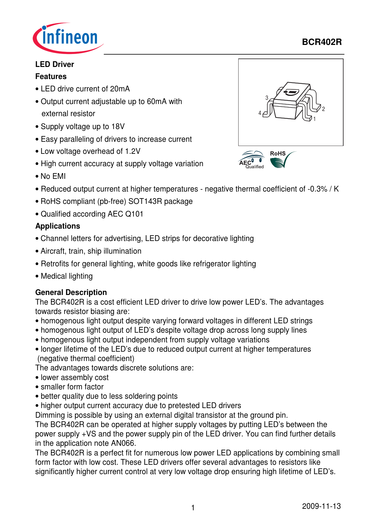 BCR402R. LED Driver. Features. Applications. General Description