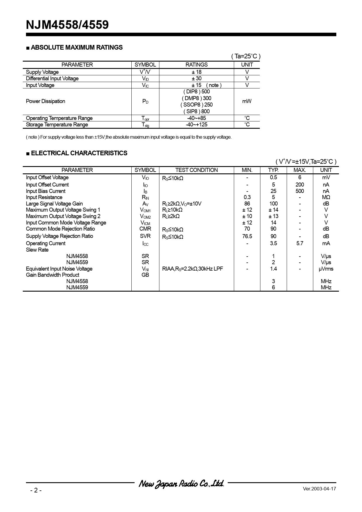 Datasheet NJM4558, NJM4559 (New Japan Radio) - 2