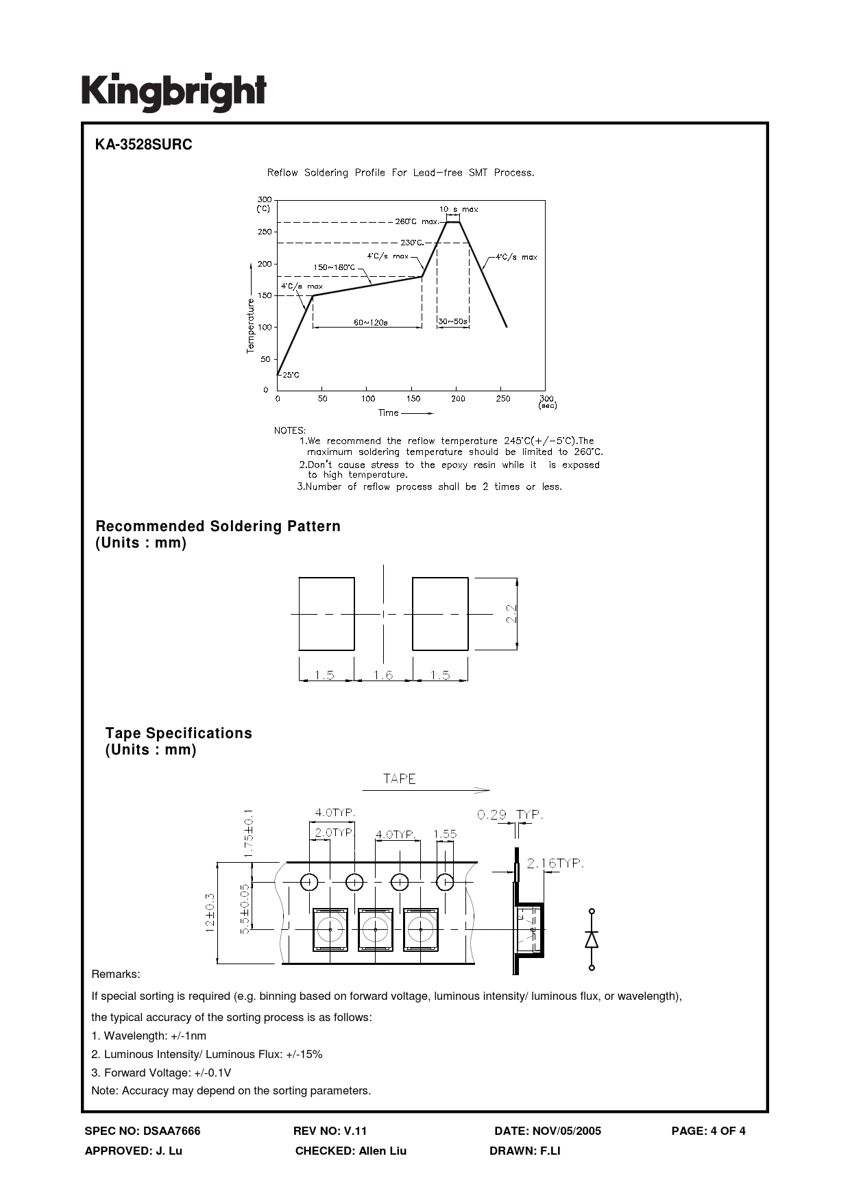 KA-3528SURCRecommended Soldering Pattern (Units : mm)Tape Specifications (Units : mm) Remarks: If special sorting is required (e.g. binning based on forward voltage, luminous intensity/ luminous flux, or wavelength), the typical accuracy of the sorting process is as follows: 1. Wavelength: +/-1nm 2. Luminous Intensity/ Luminous Flux: +/-15% 3. Forward Voltage: +/-0.1V Note: Accuracy may depend on the sorting parameters. SPEC NO: '6$$ REV NO: V.11DATE: NOV/05/2005PAGE: 4 OF 4APPROVED: J. LuCHECKED: Allen LiuDRAWN: F.LI