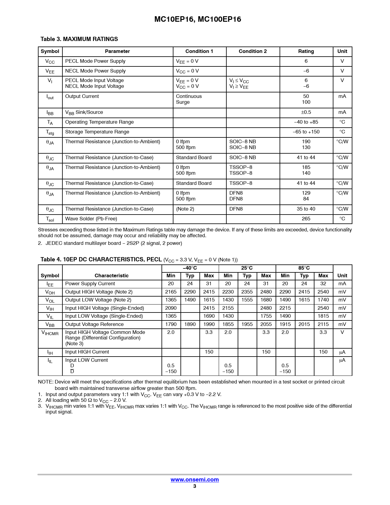 MC10EP16, MC100EP16 Table 3 MAXIMUM RATINGS Symbol Parameter Condition 1 Condition 2 Rating Unit