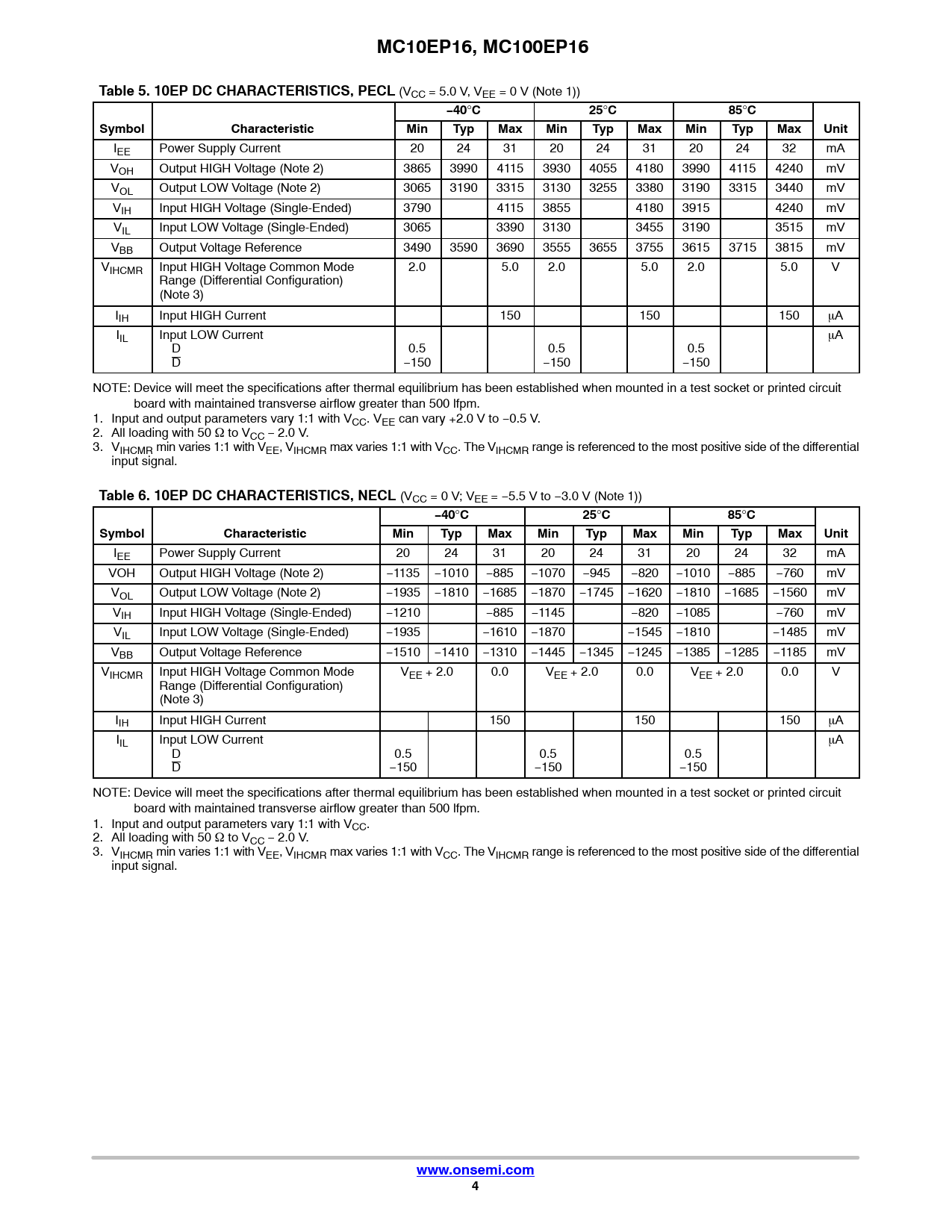 link to page 4 link to page 4 link to page 4 link to page 4 link to page 4 link to page 4 link to page 4 link to page 4 MC10EP16, MC100EP16Table 5. 10EP DC CHARACTERISTICS, PECL (VCC = 5.0 V, VEE = 0 V (Note 1)) −40 ° C25 ° C85 ° CSymbolCharacteristicMinTypMaxMinTypMaxMinTypMaxUnit IEE Power Supply Current 20 24 31 20 24 31 20 24 32 mA VOH Output HIGH Voltage (Note 2) 3865 3990 4115 3930 4055 4180 3990 4115 4240 mV VOL Output LOW Voltage (Note 2) 3065 3190 3315 3130 3255 3380 3190 3315 3440 mV VIH Input HIGH Voltage (Single-Ended) 3790 4115 3855 4180 3915 4240 mV VIL Input LOW Voltage (Single-Ended) 3065 3390 3130 3455 3190 3515 mV VBB Output Voltage Reference 3490 3590 3690 3555 3655 3755 3615 3715 3815 mV VIHCMR Input HIGH Voltage Common Mode 2.0 5.0 2.0 5.0 2.0 5.0 V Range (Differential Configuration) (Note 3) IIH Input HIGH Current 150 150 150 mA IIL Input LOW Current mA D 0.5 0.5 0.5 D −150 −150 −150 NOTE: Device will meet the specifications after thermal equilibrium has been established when mounted in a test socket or printed circuit board with maintained transverse airflow greater than 500 lfpm. 1. Input and output parameters vary 1:1 with VCC. VEE can vary +2.0 V to −0.5 V. 2. All loading with 50 W to VCC − 2.0 V. 3. VIHCMR min varies 1:1 with VEE, VIHCMR max varies 1:1 with VCC. The VIHCMR range is referenced to the most positive side of the differential input signal. Table 6. 10EP DC CHARACTERISTICS, NECL (VCC = 0 V; VEE = −5.5 V to −3.0 V (Note 1)) −40 ° C25 ° C85 ° CSymbolCharacteristicMinTypMaxMinTypMaxMinTypMaxUnit IEE Power Supply Current 20 24 31 20 24 31 20 24 32 mA VOH Output HIGH Voltage (Note 2) −1135 −1010 −885 −1070 −945 −820 −1010 −885 −760 mV VOL Output LOW Voltage (Note 2) −1935 −1810 −1685 −1870 −1745 −1620 −1810 −1685 −1560 mV VIH Input HIGH Voltage (Single-Ended) −1210 −885 −1145 −820 −1085 −760 mV VIL Input LOW Voltage (Single-Ended) −1935 −1610 −1870 −1545 −1810 −1485 mV VBB Output Voltage Reference −1510 −1410 −1310 −1445 −1345 −1245 −1385 −1285 −1185 mV VIHCMR Input HIGH Voltage Common Mode VEE + 2.0 0.0 VEE + 2.0 0.0 VEE + 2.0 0.0 V Range (Differential Configuration) (Note 3) IIH Input HIGH Current 150 150 150 mA IIL Input LOW Current mA D 0.5 0.5 0.5 D −150 −150 −150 NOTE: Device will meet the specifications after thermal equilibrium has been established when mounted in a test socket or printed circuit board with maintained transverse airflow greater than 500 lfpm. 1. Input and output parameters vary 1:1 with VCC. 2. All loading with 50 W to VCC − 2.0 V. 3. VIHCMR min varies 1:1 with VEE, VIHCMR max varies 1:1 with VCC. The VIHCMR range is referenced to the most positive side of the differential input signal. www.onsemi.com4