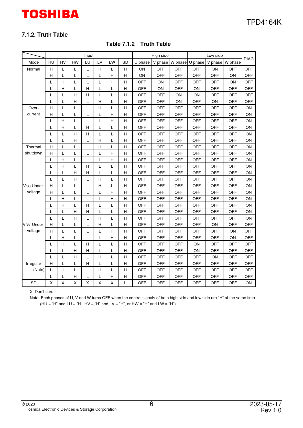 Input High side Low side DIAG Mode HU HV HW LU LV LW SD U phase V phase W phase U phase V phase W phase Normal H L L L H L H ON OFF OFF OFF ON OFF OFF H L L L L H H ON OFF OFF OFF OFF ON OFF L H L L L H H OFF ON OFF OFF OFF ON OFF L H L H L L H OFF ON OFF ON OFF OFF OFF L L H H L L H OFF OFF ON ON OFF OFF OFF L L H L H L H OFF OFF ON OFF ON OFF OFF Over- H L L L H L H OFF OFF OFF OFF OFF OFF ON current H L L L L H H OFF OFF OFF OFF OFF OFF ON L H L L L H H OFF OFF OFF OFF OFF OFF ON L H L H L L H OFF OFF OFF OFF OFF OFF ON L L H H L L H OFF OFF OFF OFF OFF OFF ON L L H L H L H OFF OFF OFF OFF OFF OFF ON Thermal H L L L H L H OFF OFF OFF OFF OFF OFF ON shutdown H L L L L H H OFF OFF OFF OFF OFF OFF ON L H L L L H H OFF OFF OFF OFF OFF OFF ON L H L H L L H OFF OFF OFF OFF OFF OFF ON L L H H L L H OFF OFF OFF OFF OFF OFF ON L L H L H L H OFF OFF OFF OFF OFF OFF ON VCC Under- H L L L H L H OFF OFF OFF OFF OFF OFF ON voltage H L L L L H H OFF OFF OFF OFF OFF OFF ON L H L L L H H OFF OFF OFF OFF OFF OFF ON L H L H L L H OFF OFF OFF OFF OFF OFF ON L L H H L L H OFF OFF OFF OFF OFF OFF ON L L H L H L H OFF OFF OFF OFF OFF OFF ON VBS Under- H L L L H L H OFF OFF OFF OFF ON OFF OFF voltage H L L L L H H OFF OFF OFF OFF OFF ON OFF L H L L L H H OFF OFF OFF OFF OFF ON OFF L H L H L L H OFF OFF OFF ON OFF OFF OFF L L H H L L H OFF OFF OFF ON OFF OFF OFF L L H L H L H OFF OFF OFF OFF ON OFF OFF Irregular H L L H L L H OFF OFF OFF OFF OFF OFF OFF (Note) L H L L H L H OFF OFF OFF OFF OFF OFF OFF L L H L L H H OFF OFF OFF OFF OFF OFF OFF SD X X X X X X L OFF OFF OFF OFF OFF OFF ON X: Don’t care Note: Each phases of U, V and W turns OFF when the control signals of both high side and low side are “H” at the same time. (HU = “H” and LU = “H”, HV = “H” and LV = “H”, or HW = “H” and LW = “H”) © 20 23 6 2023-05-17 Toshiba Electronic Devices & Storage Corporation Rev.1.0