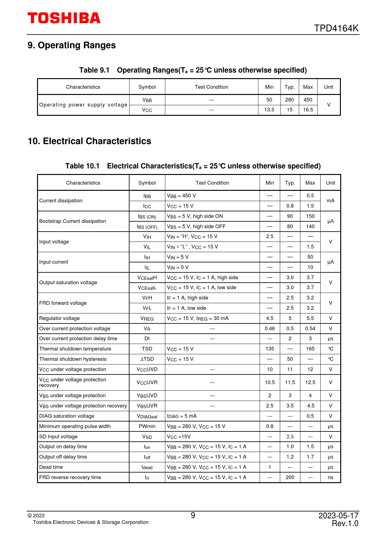 9. Operating Ranges. Table 9.1 Operating Ranges(Ta = 25°C unless otherwise specified). 10. Electrical Characteristics
