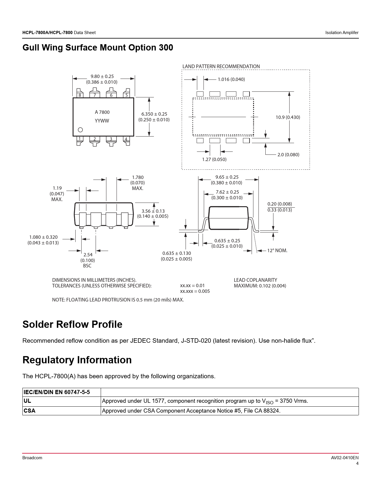 Approved under CSA Component Acceptance Notice #5, File CA 88324. Broadcom AV02-0410EN 4 Document Outline Description Features Applications Functional Diagram Ordering Information Package Outline Drawings Standard DIP Package Gull Wing Surface Mount Option 300 Solder Reflow Profile Regulatory Information IEC/EN/DIN EN 60747-5-5 Insulation Characteristics Insulation and Safety-Related Specifications Absolute Maximum Ratings Recommended Operating Conditions DC Electrical Specifications AC Electrical Specifications Package Characteristics Application Information Power Supplies and Bypassing PC Board Layout Current Sensing Resistors Sense Resistor Connections Output Side Frequently Asked Questions about the HCPL-7800(A) Basics Sense Resistor and Input Filter Isolation and Insulation Accuracy Power Supplies and Start-Up Miscellaneous