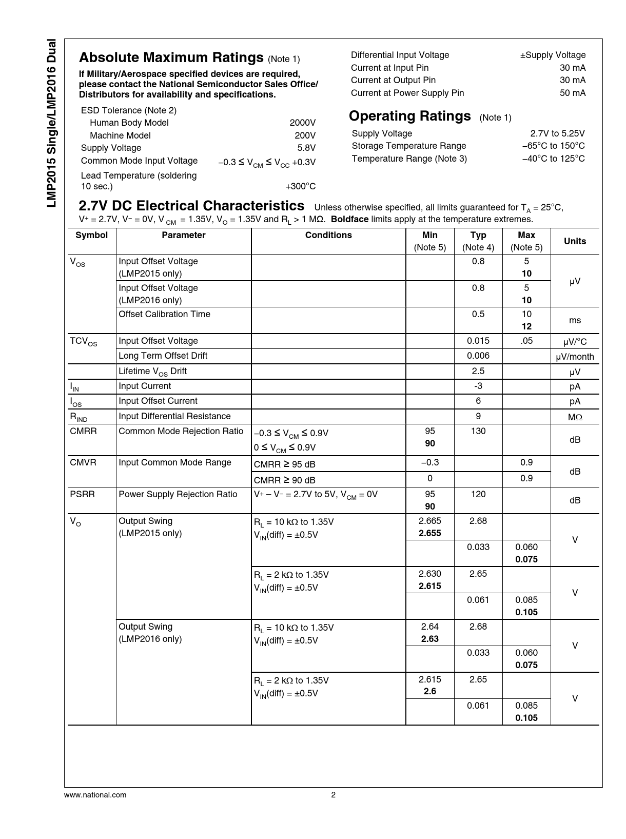 link to page 4 link to page 4 link to page 4 link to page 4 link to page 4 link to page 4 link to page 4 Absolute Maximum Ratings (Note 1) Differential Input Voltage ±Supply Voltage Current at Input Pin 30 mA If Military/Aerospace specified devices are required, please contact the National Semiconductor Sales Office/ Current at Output Pin 30 mA Distributors for availability and specifications. Current at Power Supply Pin 50 mA ESD Tolerance (Note 2) Operating Ratings (Note 1) Human Body Model 2000V Machine Model 200V Supply Voltage 2.7V to 5.25V Supply Voltage 5.8V Storage Temperature Range −65°C to 150°C Common Mode Input Voltage −0.3 ≤ V ≤ V +0.3V Temperature Range (Note 3) −40°C to 125°C CM CC Lead Temperature (soldering 10 sec.) +300°C LMP2015 Single/LMP2016 Dual2.7V DC Electrical Characteristics Unless otherwise specified, all limits guaranteed for T = 25°C, A V+ = 2.7V, V− = 0V, V = 1.35V, V = 1.35V and R > 1 MΩ. Boldface limits apply at the temperature extremes. CM O L SymbolParameterConditionsMinTypMaxUnits (Note 5) (Note 4) (Note 5) V Input Offset Voltage 0.8 5 OS (LMP2015 only) 10 μV Input Offset Voltage 0.8 5 (LMP2016 only) 10 Offset Calibration Time 0.5 10 ms 12 TCV Input Offset Voltage 0.015 .05 OS μV/°C Long Term Offset Drift 0.006 μV/month Lifetime V Drift 2.5 OS μV I Input Current -3 IN pA I Input Offset Current 6 OS pA R Input Differential Resistance 9 IND MΩ CMRR Common Mode Rejection Ratio −0.3 ≤ V ≤ 0.9V 95 130 CM dB 0 ≤ V ≤ 0.9V 90 CM CMVR Input Common Mode Range CMRR ≥ 95 dB −0.3 0.9 dB CMRR ≥ 90 dB 0 0.9 PSRR Power Supply Rejection Ratio V+ – V− = 2.7V to 5V, V = 0V 95 120 CM dB 90 V Output Swing 2.665 2.68 O R = 10 kΩ to 1.35V L (LMP2015 only) V (diff) = ±0.5V 2.655 IN V 0.033 0.060 0.075 R = 2 kΩ to 1.35V 2.630 2.65 L V (diff) = ±0.5V 2.615 IN V 0.061 0.085 0.105 Output Swing R = 10 kΩ to 1.35V 2.64 2.68 L (LMP2016 only) V (diff) = ±0.5V 2.63 IN V 0.033 0.060 0.075 R = 2 kΩ to 1.35V 2.615 2.65 L V (diff) = ±0.5V 2.6 IN V 0.061 0.085 0.105 www.national.com 2 Document Outline LMP2015 Single/LMP2016 Dual General Description Features Applications Connection Diagrams Ordering Information Absolute Maximum Ratings Operating Ratings 2.7V DC Electrical Characteristics 2.7V AC Electrical Characteristics 5V DC Electrical Characteristics 5V AC Electrical Characteristics Typical Performance Characteristics Application Information THE BENEFITS OF THE LMP2015/LMP2016'sNO 1/f NOISE OVERLOAD RECOVERY FIGURE 1. Overload Recovery Test NO EXTERNAL CAPACITORS REQUIRED MORE BENEFITS HOW THE LMP2015/LMP2016 WORK FIGURE 2. The Output of a Chopper Stabilized Op Amp (MAX432) FIGURE 3. The Output of the LMP2015/LMP2016 INPUT CURRENTS PRECISION STRAIN GAUGE AMPLIFIER FIGURE 4. Precision Strain Gauge Amplifier FIGURE 5. Composite Amplifier Configuration TABLE 1. Composite Amplifier Measured Performance FIGURE 6. Composite Amplifier Configuration FIGURE 7. AC Coupled ADC Driver LMP2015 AS AN ADC DRIVER FIGURE 8. DC Coupled ADC Driver Physical Dimensions