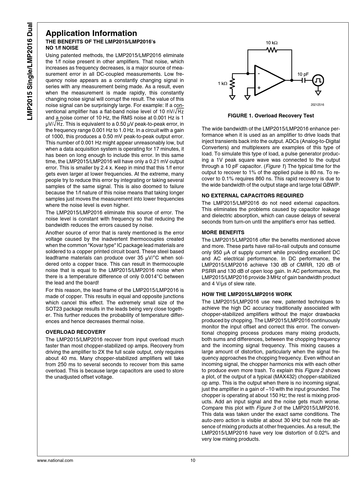 Using patented methods, the LMP2015/LMP2016 eliminate the 1/f noise present in other amplifiers. That noise, which increases as frequency decreases, is a major source of mea- surement error in all DC-coupled measurements. Low fre- quency noise appears as a constantly changing signal in series with any measurement being made. As a result, even when the measurement is made rapidly, this constantly changing noise signal will corrupt the result. The value of this noise signal can be surprisingly large. For example: If a con- 20212516 ventional amplifier has a flat-band noise level of 10 nV/