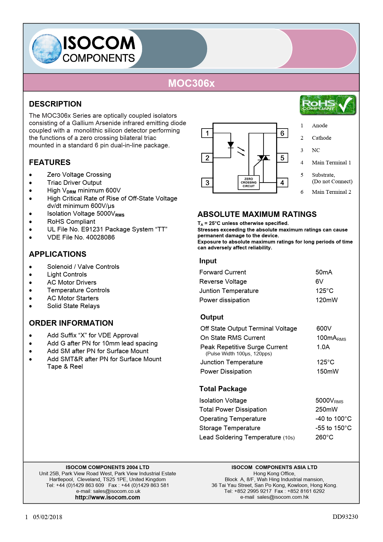 MOC306xDESCRIPTION The MOC306x Series are optically coupled isolators consisting of a Gallium Arsenide infrared emitting diode 1 Anode coupled with a monolithic silicon detector performing the functions of a zero crossing bilateral triac 2 Cathode mounted in a standard 6 pin dual-in-line package. 3 NC FEATURES 4 Main Terminal 1 • Zero Voltage Crossing 5 Substrate, • Triac Driver Output (Do not Connect) • High V DRM minimum 600V 6 Main Terminal 2 • High Critical Rate of Rise of Off-State Voltage dv/dt minimum 600V/μs • Isolation Voltage 5000V RMSABSOLUTE MAXIMUM RATINGS • RoHS Compliant TA = 25°C unless otherwise specified. • UL File No. E91231 Package System “TT” Stresses exceeding the absolute maximum ratings can cause • VDE File No. 40028086 permanent damage to the device.Exposure to absolute maximum ratings for long periods of time can adversely affect reliability.APPLICATIONSInput • Solenoid / Valve Controls • Light Controls Forward Current 50mA • AC Motor Drivers Reverse Voltage 6V • Temperature Controls Juntion Temperature 125°C • AC Motor Starters Power dissipation 120mW • Solid State Relays OutputORDER INFORMATION Off State Output Terminal Voltage 600V • Add Suffix “X” for VDE Approval On State RMS Current 100mA • RMS Add G after PN for 10mm lead spacing • Peak Repetitive Surge Current 1.0A Add SM after PN for Surface Mount (Pulse Width 100μs, 120pps) • Add SMT&R after PN for Surface Mount Junction Temperature 125°C Tape & Reel Power Dissipation 150mW Total Package Isolation Voltage 5000VRMS Total Power Dissipation 250mW Operating Temperature -40 to 100°C Storage Temperature -55 to 150°C Lead Soldering Temperature (10s) 260°C ISOCOM COMPONENTS 2004 LTDISOCOM COMPONENTS ASIA LTD Unit 25B, Park View Road West, Park View Industrial Estate Hong Kong Office, Hartlepool, Cleveland, TS25 1PE, United Kingdom Block A, 8/F, Wah Hing Industrial mansion, Tel: +44 (0)1429 863 609 Fax : +44 (0)1429 863 581 36 Tai Yau Street, San Po Kong, Kowloon, Hong Kong. e-mail: sales@isocom.co.uk Tel: +852 2995 9217 Fax : +852 8161 6292 http://www.isocom.com e-mail sales@isocom.com.hk 1 05/02/2018 DD93230