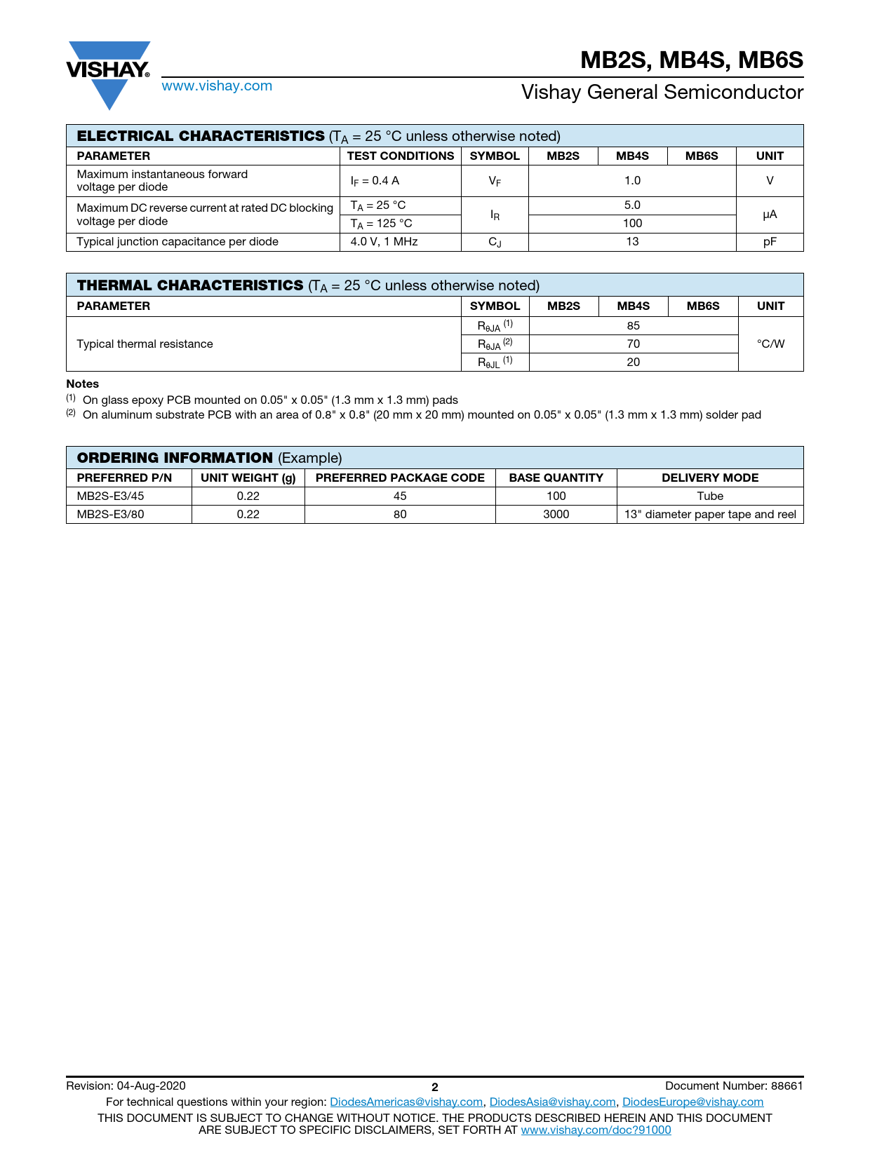 MB2S, MB4S, MB6S. ELECTRICAL CHARACTERISTICS. PARAMETER. TEST CONDITIONS. SYMBOL MB2S. MB4S. MB6S. UNIT. THERMAL CHARACTERISTICS. Notes