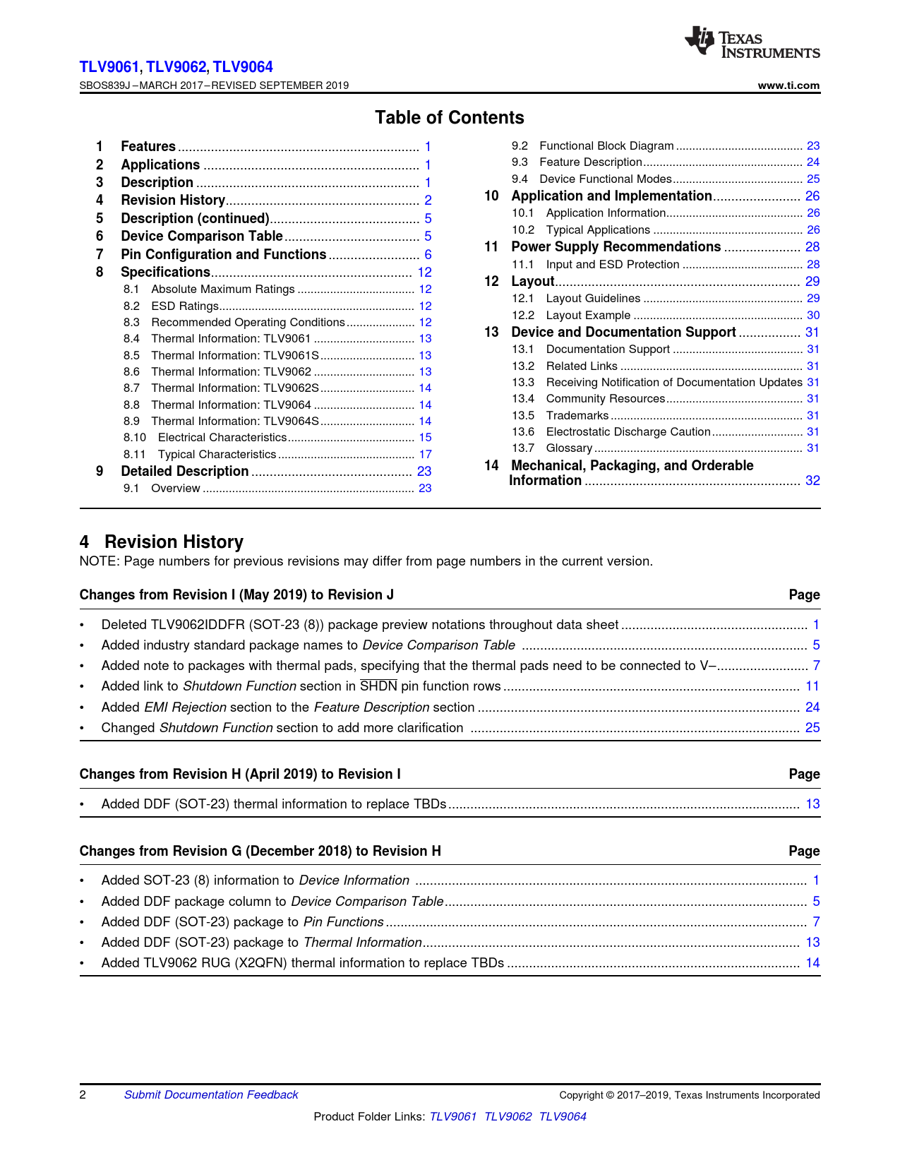 TLV9061,. TLV9062,. TLV9064. www.ti.com. Table of Contents. Features. Applications. Description. Revision History
