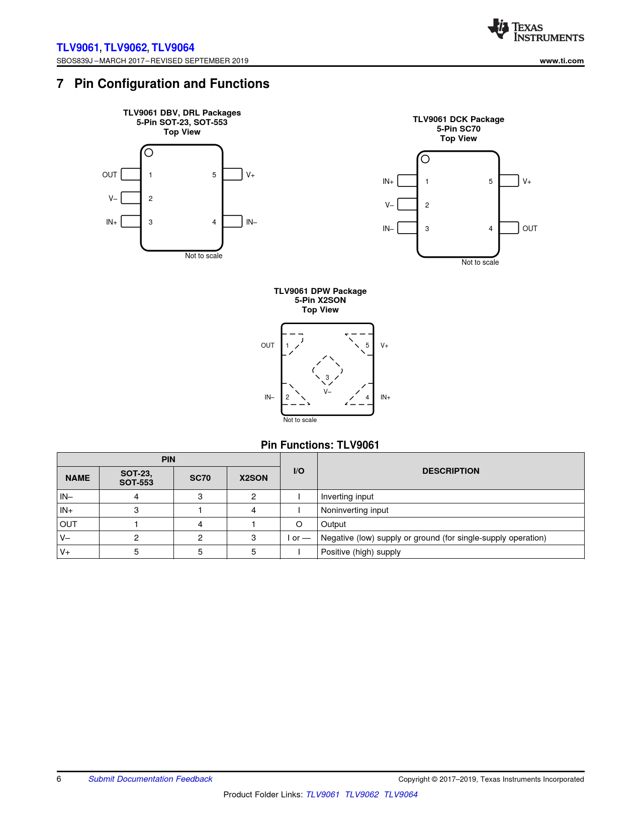 TLV9061,. TLV9062,. TLV9064. www.ti.com. 7 Pin Configuration and Functions. TLV9061 DBV, DRL Packages. 5-Pin SOT-23, SOT-553
