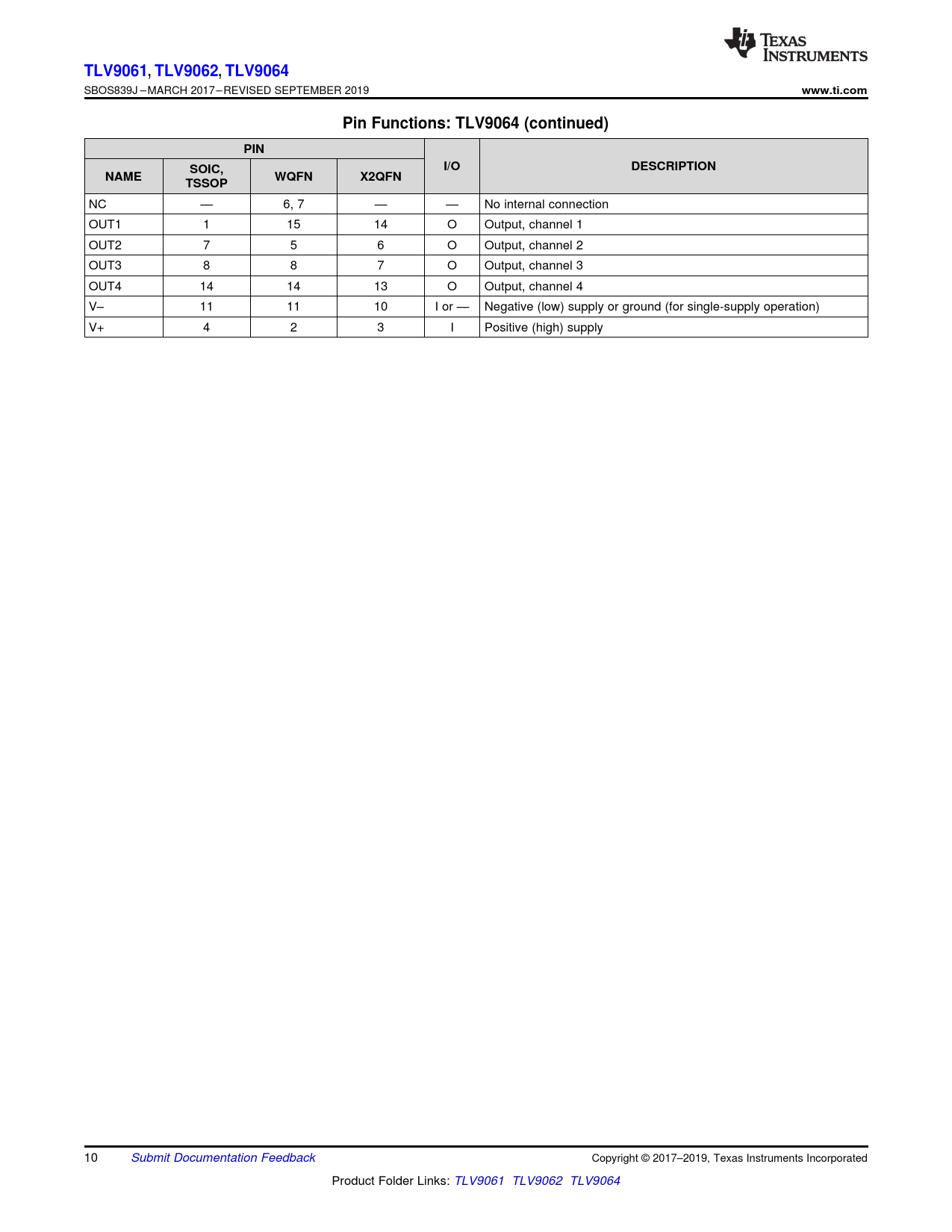 TLV9061,. TLV9062,. TLV9064. www.ti.com. Pin Functions: TLV9064 (continued). PIN. I/O. DESCRIPTION. SOIC,. NAME. WQFN. X2QFN. TSSOP