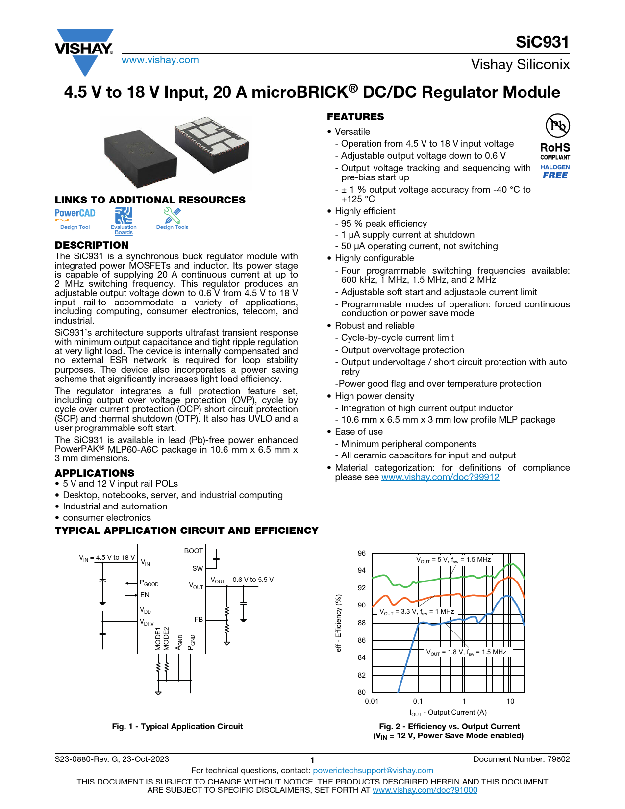 SiC931. 4.5 V to 18 V Input, 20 A microBRICK® DC/DC Regulator Module. FEATURES. LINKS TO ADDITIONAL RESOURCES. Design Tool