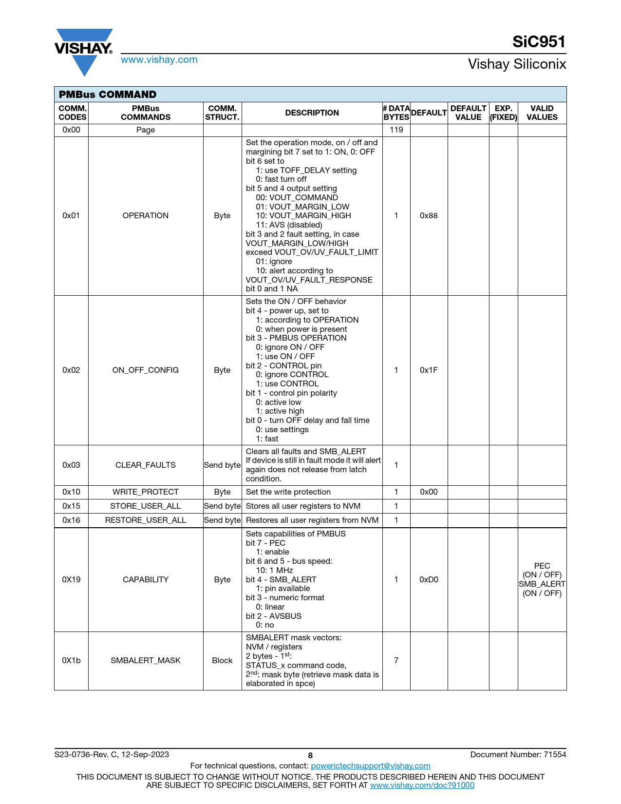 SiC951 www.vishay.com Vishay Siliconix PMBus COMMAND COMM.PMBusCOMM.# DATADEFAULTEXP.VALIDDESCRIPTIONDEFAULTCODESCOMMANDSSTRUCT.BYTESVALUE(FIXED)VALUES 0x00 Page 119 Set the operation mode, on / off and margining bit 7 set to 1: ON, 0: OFF bit 6 set to 1: use TOFF_DELAY setting 0: fast turn off bit 5 and 4 output setting 00: VOUT_COMMAND 01: VOUT_MARGIN_LOW 0x01 OPERATION Byte 10: VOUT_MARGIN_HIGH 1 0x88 11: AVS (disabled) bit 3 and 2 fault setting, in case VOUT_MARGIN_LOW/HIGH exceed VOUT_OV/UV_FAULT_LIMIT 01: ignore 10: alert according to VOUT_OV/UV_FAULT_RESPONSE bit 0 and 1 NA Sets the ON / OFF behavior bit 4 - power up, set to 1: according to OPERATION 0: when power is present bit 3 - PMBUS OPERATION 0: ignore ON / OFF 1: use ON / OFF bit 2 - CONTROL pin 0x02 ON_OFF_CONFIG Byte 1 0x1F 0: ignore CONTROL 1: use CONTROL bit 1 - control pin polarity 0: active low 1: active high bit 0 - turn OFF delay and fall time 0: use settings 1: fast Clears all faults and SMB_ALERT If device is still in fault mode it will alert 0x03 CLEAR_FAULTS Send byte 1 again does not release from latch condition. 0x10 WRITE_PROTECT Byte Set the write protection 1 0x00 0x15 STORE_USER_ALL Send byte Stores all user registers to NVM 1 0x16 RESTORE_USER_ALL Send byte Restores all user registers from NVM 1 Sets capabilities of PMBUS bit 7 - PEC 1: enable bit 6 and 5 - bus speed: PEC 10: 1 MHz (ON / OFF) 0X19 CAPABILITY Byte bit 4 - SMB_ALERT 1 0xD0 SMB_ALERT 1: pin available (ON / OFF) bit 3 - numeric format 0: linear bit 2 - AVSBUS 0: no SMBALERT mask vectors: NVM / registers 2 bytes - 1st: 0X1b SMBALERT_MASK Block 7 STATUS_x command code, 2nd: mask byte (retrieve mask data is elaborated in spce) S23-0736-Rev. C, 12-Sep-2023 8 Document Number: 71554 For technical questions, contact: powerictechsupport@vishay.com THIS DOCUMENT IS SUBJECT TO CHANGE WITHOUT NOTICE. THE PRODUCTS DESCRIBED HEREIN AND THIS DOCUMENT ARE SUBJECT TO SPECIFIC DISCLAIMERS, SET FORTH AT www.vishay.com/doc?91000