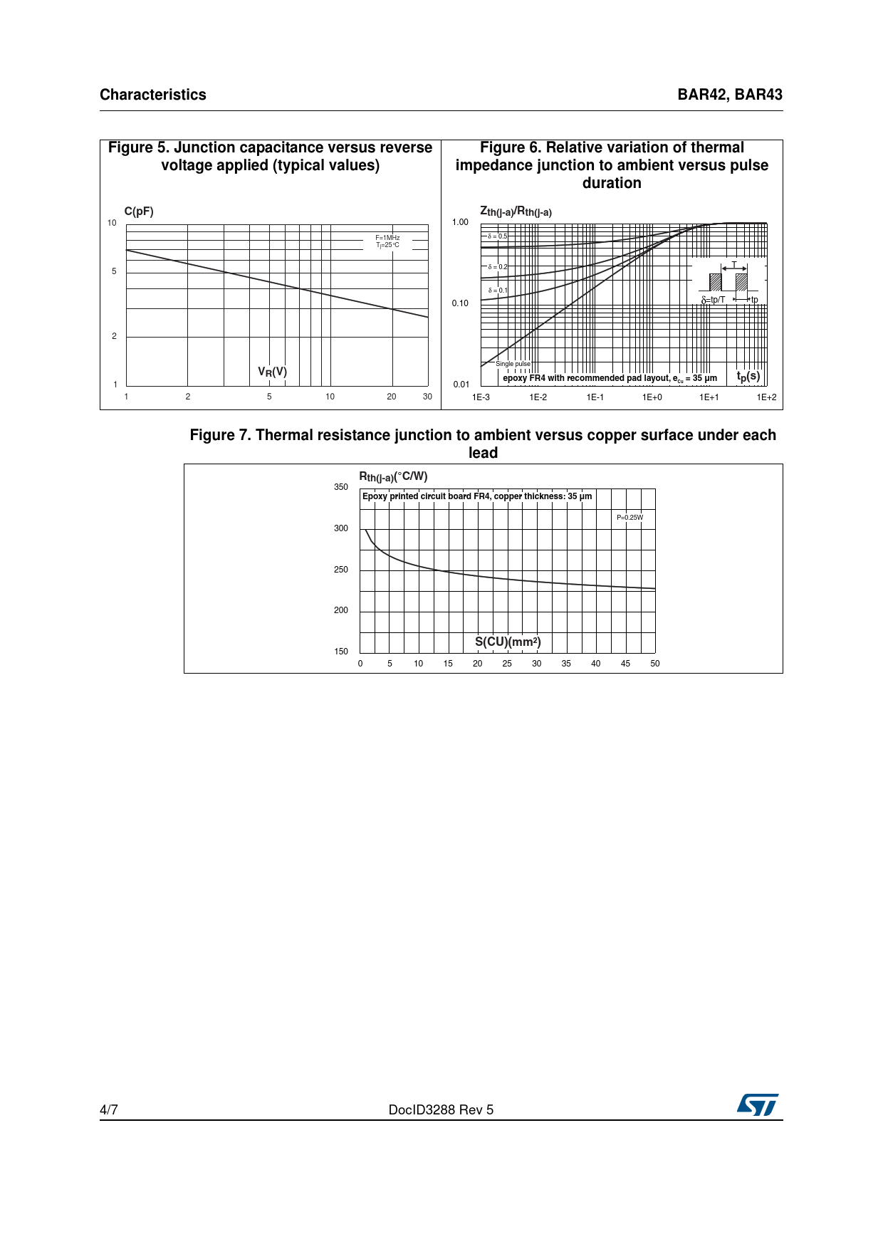 Characteristics. BAR42, BAR43. Figure 5. Junction capacitance versus reverse. Figure 6. Relative variation of thermal