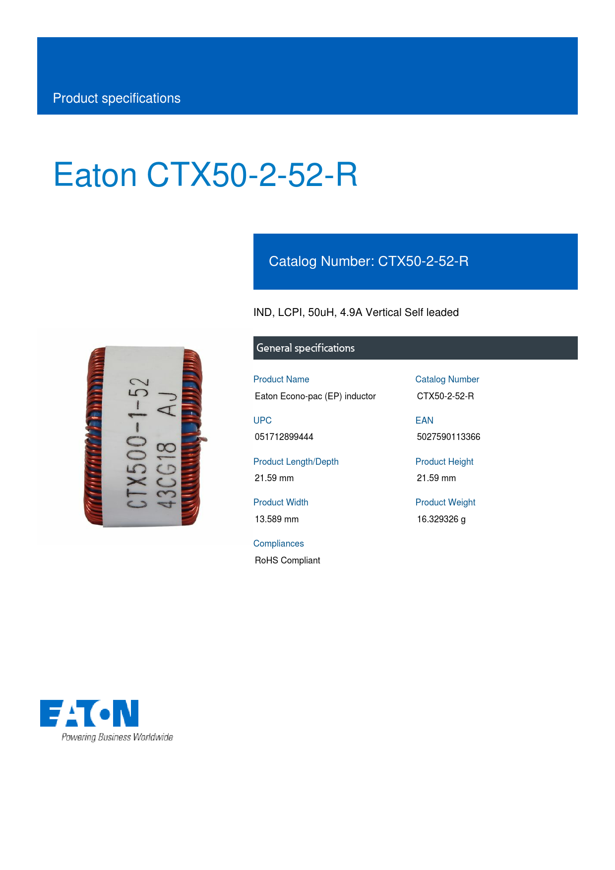 Product specifications Eaton CTX50-2-52-R Catalog Number: CTX50-2-52-R IND, LCPI, 50uH, 4.9A Vertical Self leaded General specifications Product Name Catalog Number Eaton Econo-pac (EP) inductor CTX50-2-52-R UPC EAN 051712899444 5027590113366 Product Length/Depth Product Height 21.59 mm 21.59 mm Product Width Product Weight 13.589 mm 16.329326 g Compliances RoHS Compliant