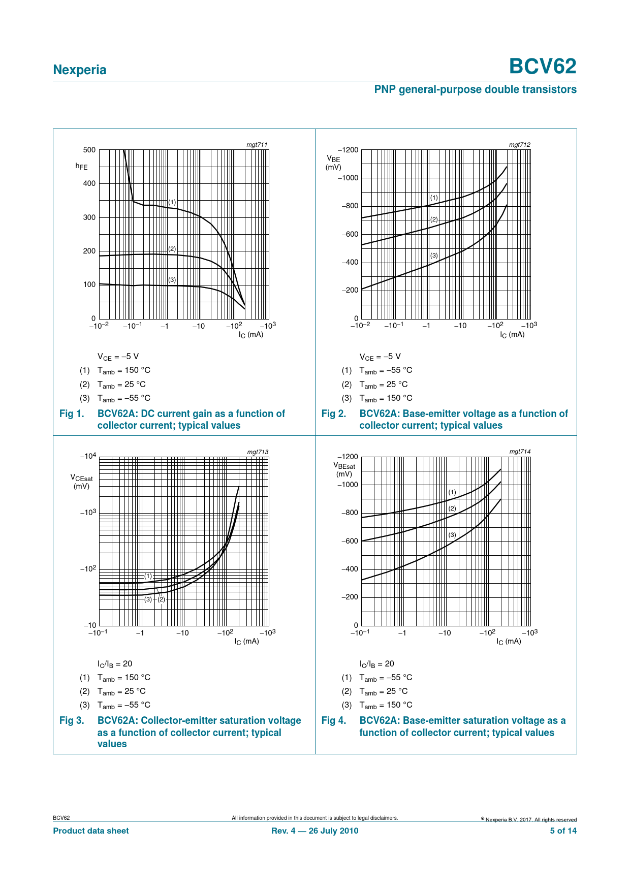 Nexperia. BCV62. PNP general-purpose double transistors. Fig 1. BCV62A: DC current gain as a function of. Fig 2