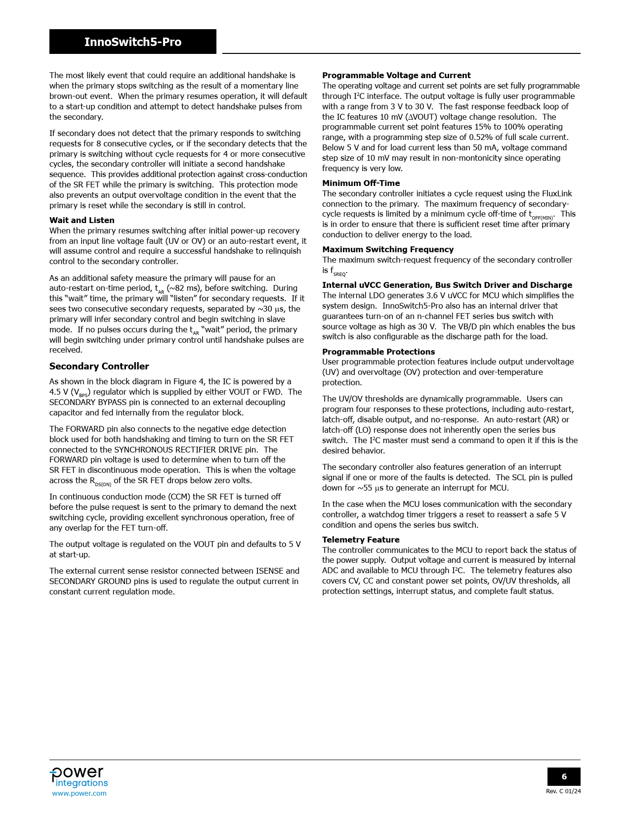 InnoSwitch5-Pro The most likely event that could require an additional handshake is Programmable Voltage and Current when the primary stops switching as the result of a momentary line The operating voltage and current set points are set fully programmable brown-out event. When the primary resumes operation, it will default through I2C interface. The output voltage is fully user programmable to a start-up condition and attempt to detect handshake pulses from with a range from 3 V to 30 V. The fast response feedback loop of the secondary. the IC features 10 mV (∆VOUT) voltage change resolution. The programmable current set point features 15% to 100% operating If secondary does not detect that the primary responds to switching range, with a programming step size of 0.52% of full scale current. requests for 8 consecutive cycles, or if the secondary detects that the Below 5 V and for load current less than 50 mA, voltage command primary is switching without cycle requests for 4 or more consecutive step size of 10 mV may result in non-montonicity since operating cycles, the secondary control er will initiate a second handshake frequency is very low. sequence. This provides additional protection against cross-conduction of the SR FET while the primary is switching. This protection mode Minimum Off-Time also prevents an output overvoltage condition in the event that the The secondary control er initiates a cycle request using the FluxLink primary is reset while the secondary is still in control. connection to the primary. The maximum frequency of secondary- cycle requests is limited by a minimum cycle off-time of t . This Wait and Listen OFF(MIN) is in order to ensure that there is sufficient reset time after primary When the primary resumes switching after initial power-up recovery conduction to deliver energy to the load. from an input line voltage fault (UV or OV) or an auto-restart event, it will assume control and require a successful handshake to relinquish Maximum Switching Frequency control to the secondary control er. The maximum switch-request frequency of the secondary control er is f . As an additional safety measure the primary will pause for an SREQ auto-restart on-time period, t (~82 ms), before switching. During Internal uVCC Generation, Bus Switch Driver and Discharge AR this “wait” time, the primary will “listen” for secondary requests. If it The internal LDO generates 3.6 V uVCC for MCU which simplifies the sees two consecutive secondary requests, separated by ~30 ms, the system design. InnoSwitch5-Pro also has an internal driver that primary will infer secondary control and begin switching in slave guarantees turn-on of an n-channel FET series bus switch with mode. If no pulses occurs during the t “wait” period, the primary source voltage as high as 30 V. The VB/D pin which enables the bus AR will begin switching under primary control until handshake pulses are switch is also configurable as the discharge path for the load. received. Programmable ProtectionsSecondary Controller User programmable protection features include output undervoltage (UV) and overvoltage (OV) protection and over-temperature As shown in the block diagram in Figure 4, the IC is powered by a protection. 4.5 V (V ) regulator which is supplied by either VOUT or FWD. The BPS SECONDARY BYPASS pin is connected to an external decoupling The UV/OV thresholds are dynamical y programmable. Users can capacitor and fed internal y from the regulator block. program four responses to these protections, including auto-restart, latch-off, disable output, and no-response. An auto-restart (AR) or The FORWARD pin also connects to the negative edge detection latch-off (LO) response does not inherently open the series bus block used for both handshaking and timing to turn on the SR FET switch. The I2C master must send a command to open it if this is the connected to the SYNCHRONOUS RECTIFIER DRIVE pin. The desired behavior. FORWARD pin voltage is used to determine when to turn off the SR FET in discontinuous mode operation. This is when the voltage The secondary control er also features generation of an interrupt across the R of the SR FET drops below zero volts. signal if one or more of the faults is detected. The SCL pin is pulled DS(ON) down for ~55 ms to generate an interrupt for MCU. In continuous conduction mode (CCM) the SR FET is turned off before the pulse request is sent to the primary to demand the next In the case when the MCU loses communication with the secondary switching cycle, providing excel ent synchronous operation, free of control er, a watchdog timer triggers a reset to reassert a safe 5 V any overlap for the FET turn-off. condition and opens the series bus switch. The output voltage is regulated on the VOUT pin and defaults to 5 V Telemetry Feature at start-up. The control er communicates to the MCU to report back the status of the power supply. Output voltage and current is measured by internal The external current sense resistor connected between ISENSE and ADC and available to MCU through I2C. The telemetry features also SECONDARY GROUND pins is used to regulate the output current in covers CV, CC and constant power set points, OV/UV thresholds, all constant current regulation mode. protection settings, interrupt status, and complete fault status. 6 Rev. C 01/24 www.power.com