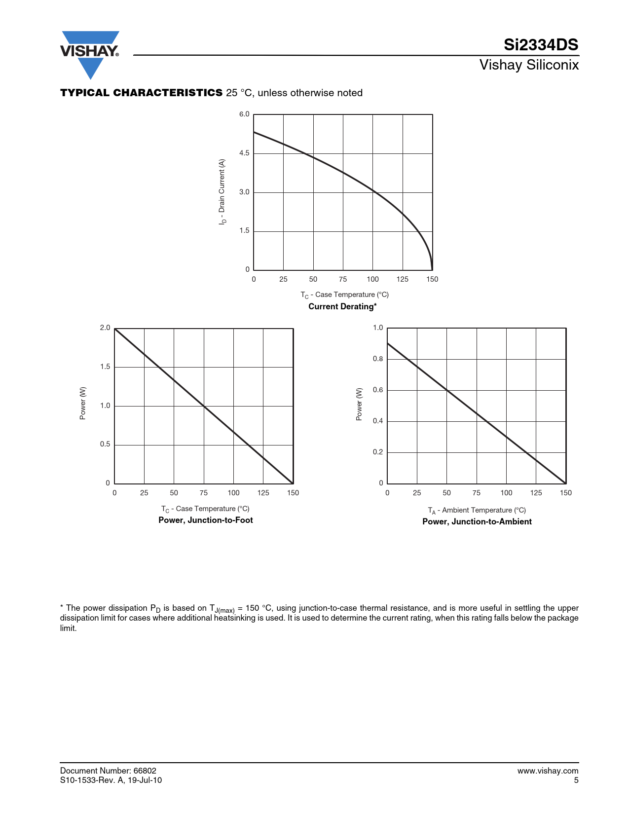 * The power dissipation PD is based on TJ(max) = 150 °C, using junction-to-case thermal resistance, and is more useful in settling the upper dissipation limit for cases where additional heatsinking is used. It is used to determine the current rating, when this rating falls below the package limit. Document Number: 66802 www.vishay.com S10-1533-Rev. A, 19-Jul-10 5