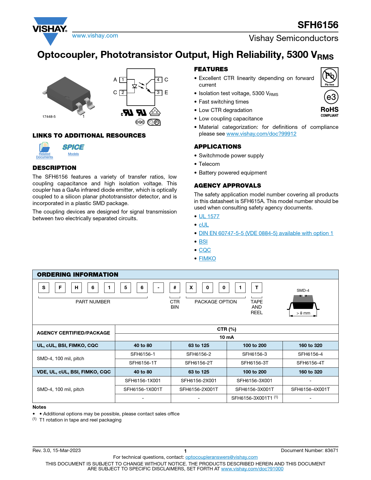 SFH6156 www.vishay.com Vishay Semiconductors Optocoupler, Phototransistor Output, High Reliability, 5300 VRMSFEATURES • Excellent CTR linearity depending on forward A 1 4 C current C 2 3 E • Isolation test voltage, 5300 VRMS • Fast switching times • Low CTR degradation 17448-5 1 • Low coupling capacitance • Material categorization: for definitions of compliance LINKS TO ADDITIONAL RESOURCES please see www.vishay.com/doc?99912 APPLICATIONSRelatedModels • Switchmode power supply DocumentsDESCRIPTION • Telecom • Battery powered equipment The SFH6156 features a variety of transfer ratios, low coupling capacitance and high isolation voltage. This AGENCY APPROVALS coupler has a GaAs infrared diode emitter, which is optically coupled to a silicon planar phototransistor detector, and is The safety application model number covering all products incorporated in a plastic SMD package. in this datasheet is SFH615A. This model number should be used when consulting safety agency documents. The coupling devices are designed for signal transmission between two electrically separated circuits. • UL 1577 • cUL • DIN EN 60747-5-5 (VDE 0884-5) available with option 1 • BSI • CQC • FIMKO ORDERING INFORMATIONSFH6156-#X001T SMD-4 PART NUMBER CTR PACKAGE OPTION TAPE BIN AND REEL > 8 mm CTR (%)AGENCY CERTIFIED/PACKAGE10 mAUL, cUL, BSI, FIMKO, CQC40 to 8063 to 125100 to 200160 to 320 SFH6156-1 SFH6156-2 SFH6156-3 SFH6156-4 SMD-4, 100 mil, pitch SFH6156-1T SFH6156-2T SFH6156-3T SFH6156-4T VDE, UL, cUL, BSI, FIMKO, CQC40 to 8063 to 125100 to 200160 to 320 SFH6156-1X001 SFH6156-2X001 SFH6156-3X001 - SMD-4, 100 mil, pitch SFH6156-1X001T SFH6156-2X001T SFH6156-3X001T SFH6156-4X001T - - SFH6156-3X001T1 (1) - Notes • • Additional options may be possible, please contact sales office (1) T1 rotation in tape and reel packaging Rev. 3.0, 15-Mar-2023 1 Document Number: 83671 For technical questions, contact: optocoupleranswers@vishay.com THIS DOCUMENT IS SUBJECT TO CHANGE WITHOUT NOTICE. THE PRODUCTS DESCRIBED HEREIN AND THIS DOCUMENT ARE SUBJECT TO SPECIFIC DISCLAIMERS, SET FORTH AT www.vishay.com/doc?91000