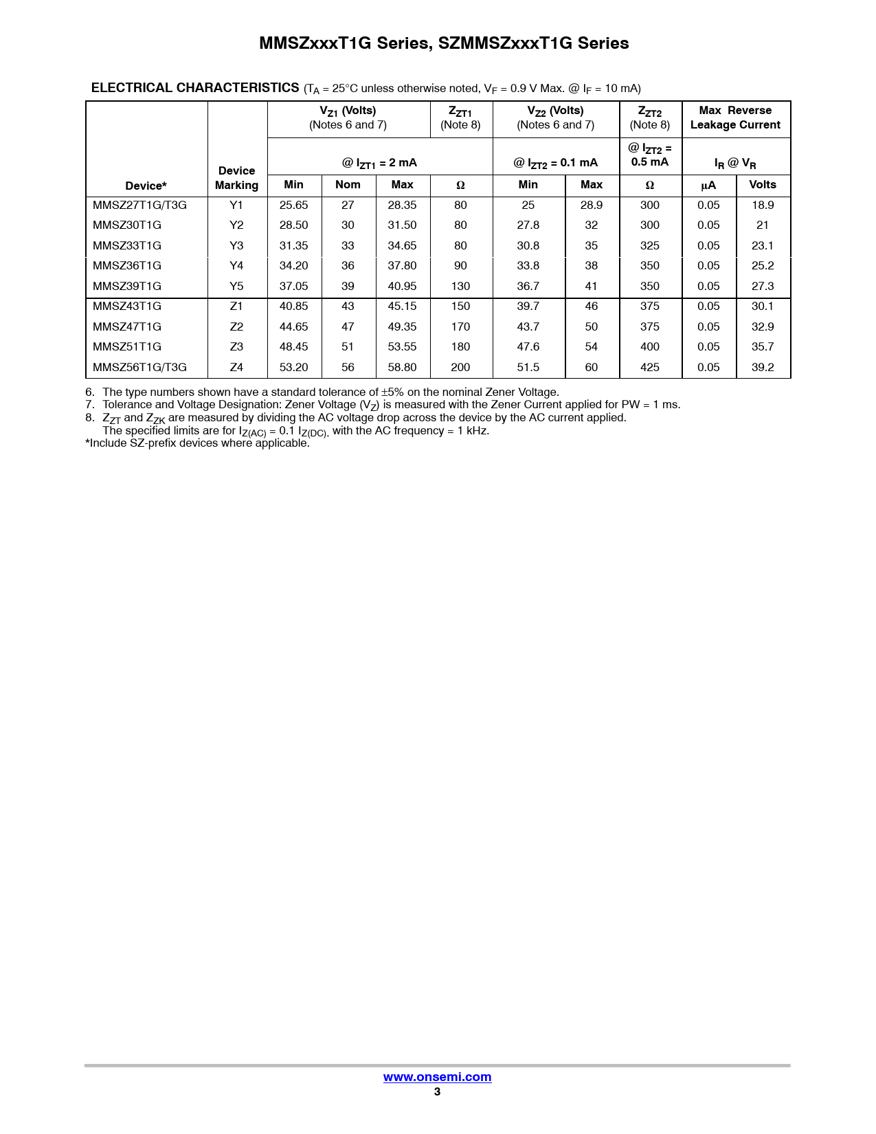 MMSZ27T1G/T3G Y1 25.65 27 28.35 80 25 28.9 300 0.05 18.9 MMSZ30T1G Y2 28.50 30 31.50 80 27.8 32 300 0.05 21 MMSZ33T1G Y3 31.35 33 34.65 80 30.8 35 325 0.05 23.1 MMSZ36T1G Y4 34.20 36 37.80 90 33.8 38 350 0.05 25.2 MMSZ39T1G Y5 37.05 39 40.95 130 36.7 41 350 0.05 27.3 MMSZ43T1G Z1 40.85 43 45.15 150 39.7 46 375 0.05 30.1 MMSZ47T1G Z2 44.65 47 49.35 170 43.7 50 375 0.05 32.9 MMSZ51T1G Z3 48.45 51 53.55 180 47.6 54 400 0.05 35.7 MMSZ56T1G/T3G Z4 53.20 56 58.80 200 51.5 60 425 0.05 39.2 6. The type numbers shown have a standard tolerance of ±5% on the nominal Zener Voltage. 7. Tolerance and Voltage Designation: Zener Voltage (VZ) is measured with the Zener Current applied for PW = 1 ms. 8. ZZT and ZZK are measured by dividing the AC voltage drop across the device by the AC current applied. The specified limits are for IZ(AC) = 0.1 IZ(DC), with the AC frequency = 1 kHz. *Include SZ-prefix devices where applicable.