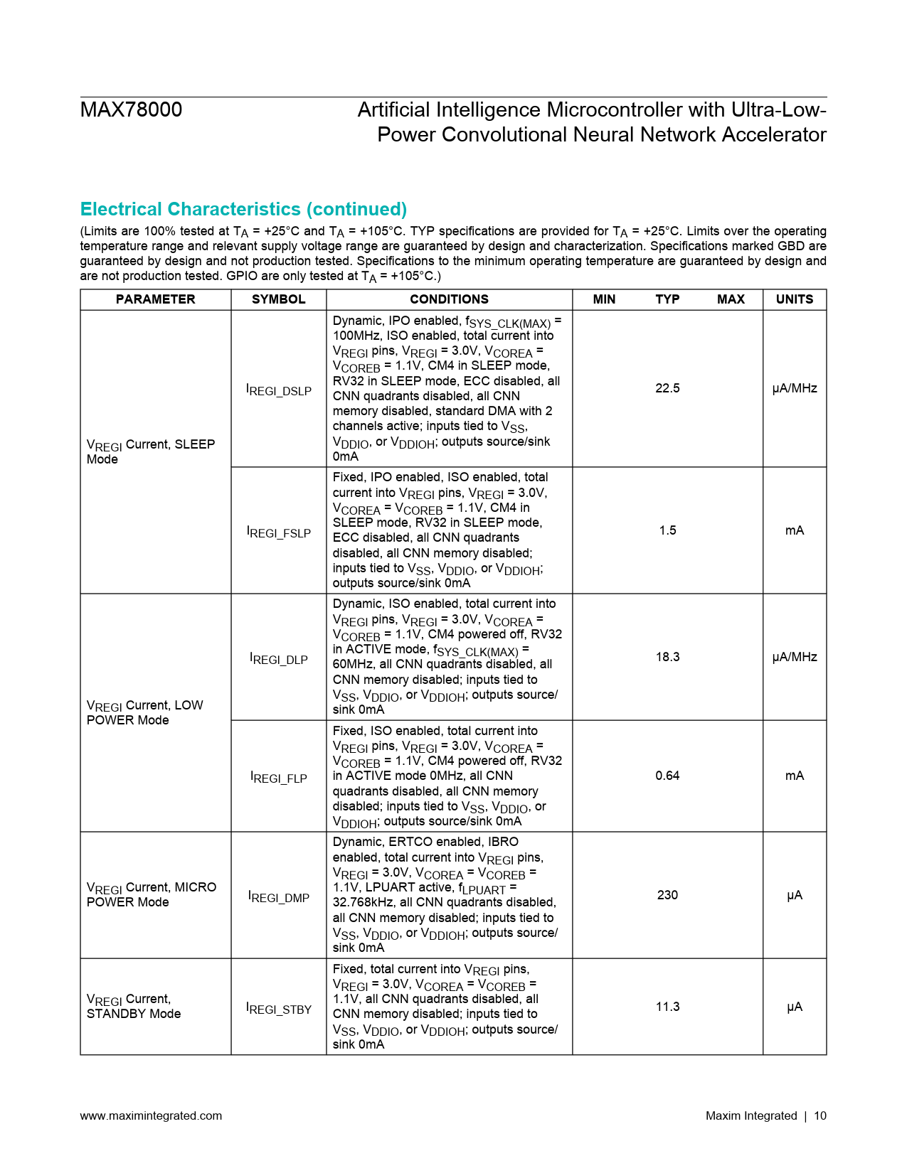 Dynamic, IPO enabled, fSYS_CLK(MAX) = 100MHz, ISO enabled, total current into VREGI pins, VREGI = 3.0V, VCOREA = VCOREB = 1.1V, CM4 in SLEEP mode, RV32 in SLEEP mode, ECC disabled, all IREGI_DSLP 22.5 μA/MHz CNN quadrants disabled, all CNN memory disabled, standard DMA with 2 channels active; inputs tied to VSS, VREGI Current, SLEEP VDDIO, or VDDIOH; outputs source/sink Mode 0mA Fixed, IPO enabled, ISO enabled, total current into VREGI pins, VREGI = 3.0V, VCOREA = VCOREB = 1.1V, CM4 in SLEEP mode, RV32 in SLEEP mode, IREGI_FSLP 1.5 mA ECC disabled, all CNN quadrants disabled, all CNN memory disabled; inputs tied to VSS, VDDIO, or VDDIOH; outputs source/sink 0mA Dynamic, ISO enabled, total current into VREGI pins, VREGI = 3.0V, VCOREA = VCOREB = 1.1V, CM4 powered off, RV32 in ACTIVE mode, f I SYS_CLK(MAX) = REGI_DLP 18.3 μA/MHz 60MHz, all CNN quadrants disabled, all CNN memory disabled; inputs tied to VSS, VDDIO, or VDDIOH; outputs source/ VREGI Current, LOW sink 0mA POWER Mode Fixed, ISO enabled, total current into VREGI pins, VREGI = 3.0V, VCOREA = VCOREB = 1.1V, CM4 powered off, RV32 IREGI_FLP in ACTIVE mode 0MHz, all CNN 0.64 mA quadrants disabled, all CNN memory disabled; inputs tied to VSS, VDDIO, or VDDIOH; outputs source/sink 0mA Dynamic, ERTCO enabled, IBRO enabled, total current into VREGI pins, VREGI = 3.0V, VCOREA = VCOREB = VREGI Current, MICRO 1.1V, LPUART active, f I LPUART = 230 μA POWER Mode REGI_DMP 32.768kHz, all CNN quadrants disabled, all CNN memory disabled; inputs tied to VSS, VDDIO, or VDDIOH; outputs source/ sink 0mA Fixed, total current into VREGI pins, VREGI = 3.0V, VCOREA = VCOREB = VREGI Current, 1.1V, all CNN quadrants disabled, all I 11.3 μA STANDBY Mode REGI_STBY CNN memory disabled; inputs tied to VSS, VDDIO, or VDDIOH; outputs source/ sink 0mA www.maximintegrated.com Maxim Integrated | 10 Document Outline General Description Applications Benefits and Features Simplified Block Diagram Absolute Maximum Ratings Package Information 81-CTBGA Electrical Characteristics Electrical Characteristics (continued) Electrical Characteristics—SPI Electrical Characteristics—SPI (continued) Electrical Characteristics—I2C Electrical Characteristics—I2C (continued) Electrical Characteristics—I2S Electrical Characteristics—I2S (continued) Electrical Characteristics—PCIF Electrical Characteristics—1-Wire Master Electrical Characteristics—1-Wire Master (continued) Pin Configuration 81 CTBGA Pin Description 81 CTBGA Detailed Description Arm Cortex-M4 with FPU Processor and RISC-V RV32 Processor Convolutional Neural Network Accelerator (CNN) Memory Internal Flash Memory Internal SRAM Comparators Dynamic Voltage Scaling (DVS) Controller Clocking Scheme General-Purpose I/O and Special Function Pins Parallel Camera Interface (PCIF) Analog-to-Digital Converter Single-Inductor Multiple-Output Switch-Mode Power Supply (SIMO SMPS) Power Management Power Management Unit ACTIVE Mode SLEEP Mode LOW POWER Mode (LPM) MICRO POWER Mode (μPM) STANDBY Mode BACKUP Mode POWER DOWN Mode (PDM) Wakeup Sources Real-Time Clock Programmable Timers 32-Bit Timer/Counter/PWM (TMR, LPTMR) Watchdog Timer (WDT) Pulse Train Engine (PT) Serial Peripherals I2C Interface (I2C) I2S Interface (I2S) Serial Peripheral Interface (SPI) UART (UART, LPUART) 1-Wire Master (OWM) Standard DMA Controller Security AES True Random Number Generator (TRNG) Non-Deterministic Random Bit Generator (NDRBG) CRC Module Bootloader Secure Boot Debug and Development Interface (SWD, JTAG) Applications Information Bypass Capacitors Ordering Information Revision History