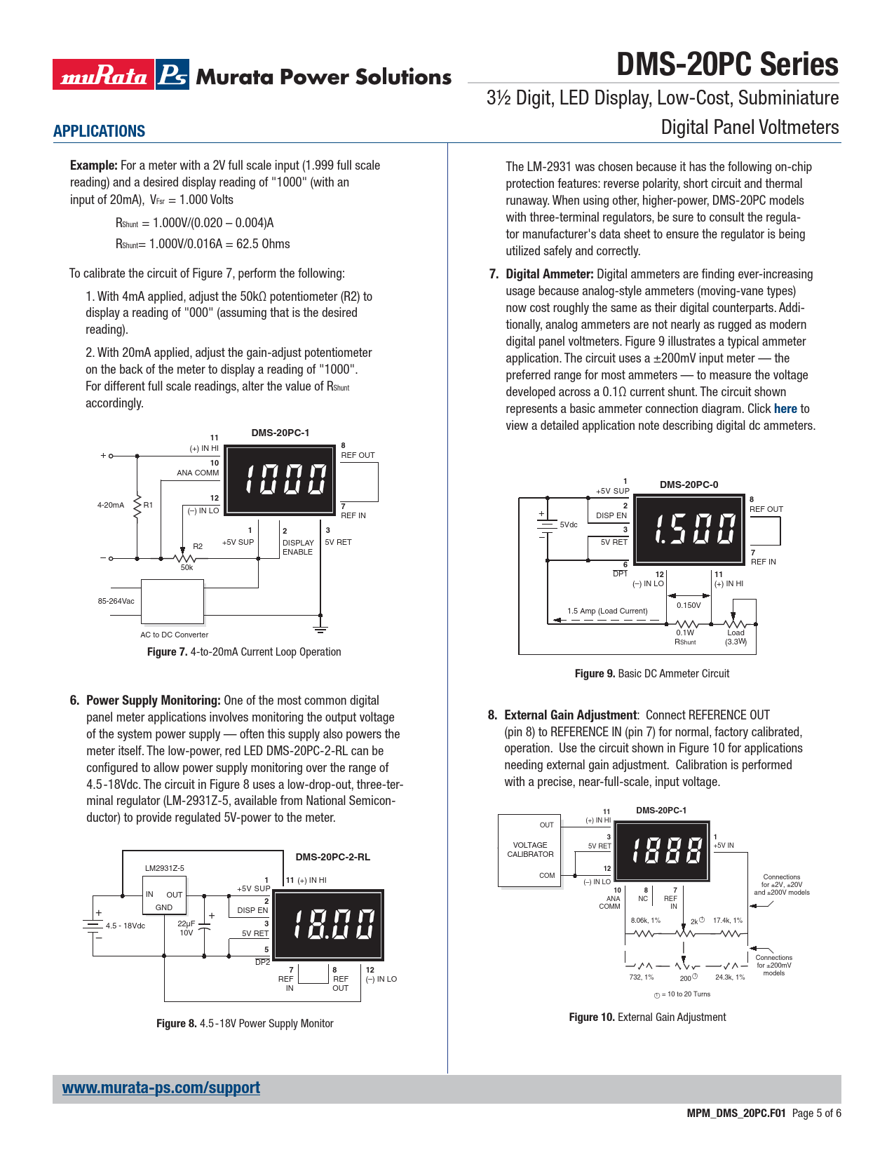 DMS-20PC Series 3½ Digit, LED Display, Low-Cost, Subminiature APPLICATIONS Digital Panel Voltmeters Example: For a meter with a 2V full scale input (1.999 full scale The LM-2931 was chosen because it has the following on-chip reading) and a desired display reading of "1000" (with an protection features: reverse polarity, short circuit and thermal input of 20mA), VFsr = 1.000 Volts runaway. When using other, higher-power, DMS-20PC models with three-terminal regulators, be sure to consult the regula- RShunt = 1.000V/(0.020 – 0.004)A tor manufacturer's data sheet to ensure the regulator is being RShunt= 1.000V/0.016A = 62.5 Ohms utilized safely and correctly. To calibrate the circuit of Figure 7, perform the following: 7. Digital Ammeter: Digital ammeters are fi nding ever-increasing 1. With 4mA applied, adjust the 50kΩ potentiometer (R2) to usage because analog-style ammeters (moving-vane types) display a reading of "000" (assuming that is the desired now cost roughly the same as their digital counterparts. Addi- reading). tionally, analog ammeters are not nearly as rugged as modern digital panel voltmeters. Figure 9 illustrates a typical ammeter 2. With 20mA applied, adjust the gain-adjust potentiometer application. The circuit uses a ±200mV input meter — the on the back of the meter to display a reading of "1000". preferred range for most ammeters — to measure the voltage For different full scale readings, alter the value of RShunt developed across a 0.1Ω current shunt. The circuit shown accordingly. http://www.murata-ps.com/data/meters/dms-an6.pdf represents a basic ammeter connection diagram. Click here to view a detailed application note describing digital dc ammeters. DMS-20PC-111 (+) IN HI 8 + REF OUT 10 ANA COMM 1DMS-20PC-0 +5V SUP 128 4-20mA R1 72 (–) IN LO REF OUT REF IN + DISP EN 5Vdc 1233 – +5V SUP DISPLAY 5V RET 5V RET R2 ENABLE – 7 REF IN 50k 6 DP1 1211 (–) IN LO (+) IN HI 85-264Vac 0.150V 1.5 Amp (Load Current) AC to DC Converter 0.1W Load RShunt (3.3 ) W Figure 7. 4-to-20mA Current Loop Operation Figure 9. Basic DC Ammeter Circuit 6. Power Supply Monitoring: One of the most common digital panel meter applications involves monitoring the output voltage 8. External Gain Adjustment : Connect REFERENCE OUT of the system power supply — often this supply also powers the (pin 8) to REFERENCE IN (pin 7) for normal, factory calibrated, meter itself. The low-power, red LED DMS-20PC-2-RL can be operation. Use the circuit shown in Figure 10 for applications confi gured to allow power supply monitoring over the range of needing external gain adjustment. Calibration is performed 4.5-18Vdc. The circuit in Figure 8 uses a low-drop-out, three-ter- with a precise, near-full-scale, input voltage. minal regulator (LM-2931Z-5, available from National Semicon- 11DMS-20PC-1 ductor) to provide regulated 5V-power to the meter. (+) IN HI OUT 31 VOLTAGE 5V RET +5V IN 12DMS-20PC-2-RL CALIBRATOR LM2931Z-5 12 COM 111 (+) IN HI Connections (–) IN LO for ±2V, ±20V +5V SUP 1087 IN OUT and ±200V models 2 ANA NC REF COMM IN + GND DISP EN + 8.06k, 1% 1 2k 17.4k, 1% 4.5 - 18Vdc 22µF 3 10V – 5V RET 5 Connections DP2 for ±200mV 7812 models 1 REF REF (–) IN LO 732, 1% 24.3k, 1% 200 IN OUT 1 = 10 to 20 Turns Figure 10. External Gain Adjustment Figure 8. 4.5 -18V Power Supply Monitor www.murata-ps.com/supportMPM_DMS_20PC.F01 Page 5 of 6