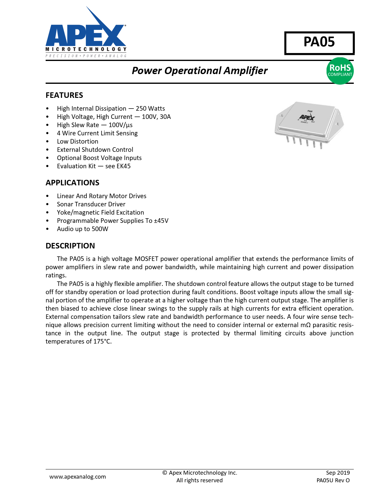 PA05. Power Operational Amplifier. RoHS. FEATURES. APPLICATIONS. DESCRIPTION