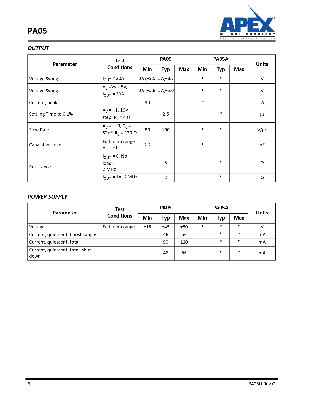 PA05OUTPUTPA05PA05AParameterTestConditionsUnitsMinTypMaxMinTypMax Voltage Swing IOUT = 20A ±VS–9.5 ±VS–8.7 * * V V Voltage Swing B =Vs + 5V, ±V I S–5.8 ±VS–5.0 * * V OUT = 30A Current, peak 30 * A A Settling Time to 0.1% V = +1, 10V step, RL = 4 Ω 2.5 * µs A Slew Rate V = –10, CC = 82pF, RC = 120 Ω 80 100 * * V/µs Ful temp range, Capacitive Load AV = +1 2.2 * nF IOUT = 0, No load, 5 * Ω Resistance 2 MHz IOUT = 1A, 2 MHz 2 * Ω POWER SUPPLYPA05PA05AParameterTestConditionsUnitsMinTypMaxMinTypMax Voltage Ful temp range ±15 ±45 ±50 * * * V Current, quiescent, boost supply 46 56 * * mA Current, quiescent, total 90 120 * * mA Current, quiescent, total, shut- down 46 56 * * mA 6 PA05U Rev O Document Outline PA05 Features Applications Description Figure 1: Equivalent Schematic Typical Connection Figure 2: Typical Connections Pinout and Description Table Figure 3: External Connections Specifications Absolute Maximum Ratings Input Gain Output Power Supply Thermal Typical Performance Graphs SAFE OPERATING AREA (SOA) 1. The current handling capability of the MOSFET geometry and the wire bonds. 2. The junction temperature of the output MOSFETs. Figure 16: SOA General Typical Application Figure 17: Typical Application Phase Compensation Current Limit Figure 18: Current Limit Shutdown Operation Figure 19: Shutdown Operation Boost Operation Compensation Package Design Package Style CR