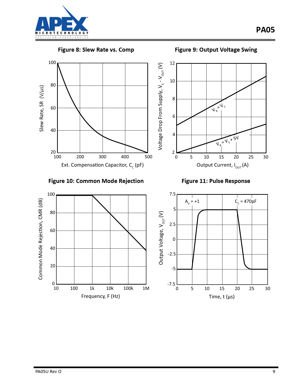 PA05. Figure 8: Slew Rate vs. Comp. Figure 9: Output Voltage Swing. Figure 10: Common Mode Rejection. Figure 11: Pulse Response