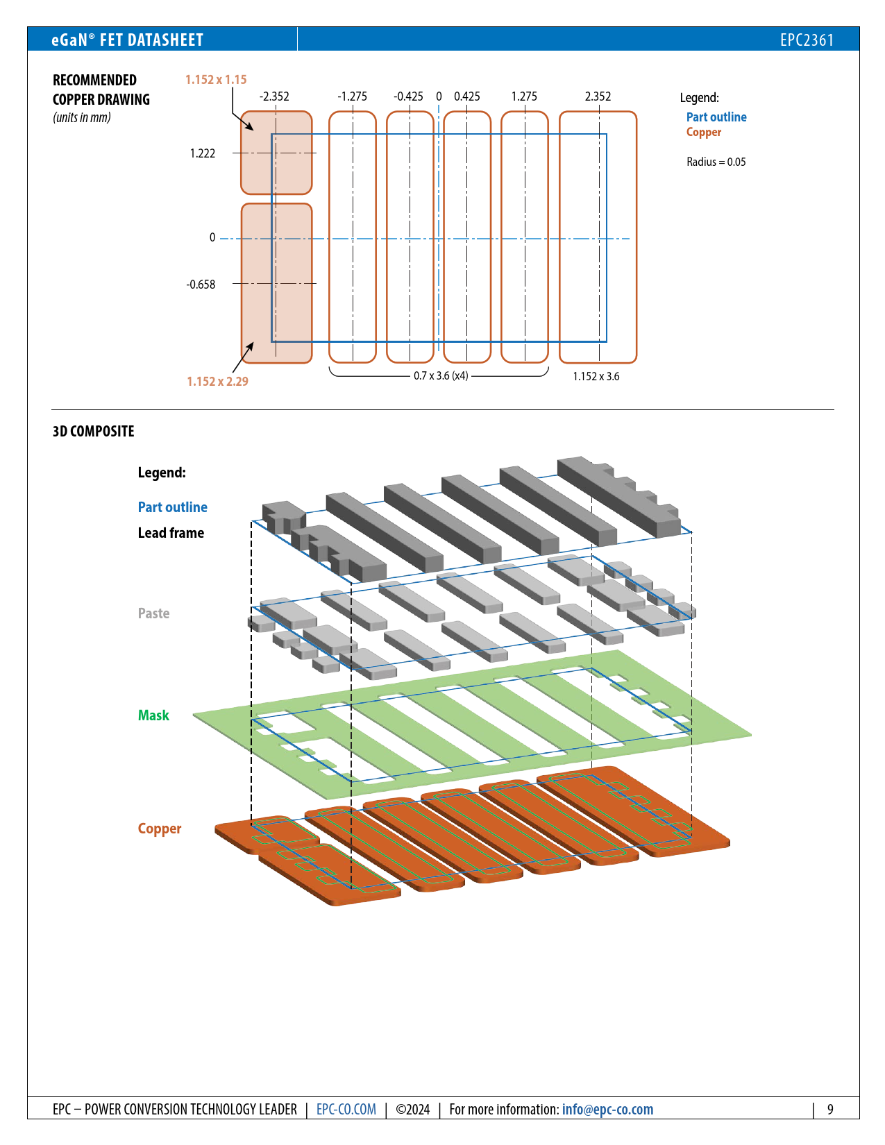 eGaN® FET DATASHEET. RECOMMENDED. 1.152 x 1.15. COPPER DRAWING. Part outline. Copper. 1.152 x 2.29. 3D COMPOSITE. Legend: