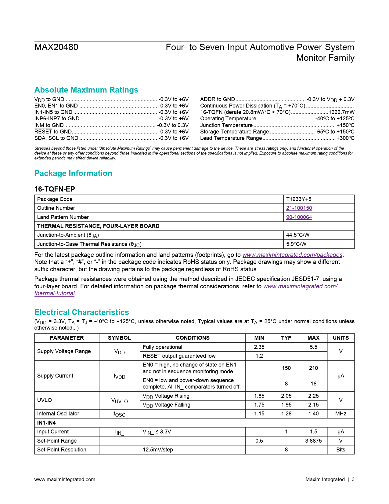 Absolute Maximum Ratings. Package Information. 16-TQFN-EP. THERMAL RESISTANCE, FOUR-LAYER BOARD. Electrical Characteristics