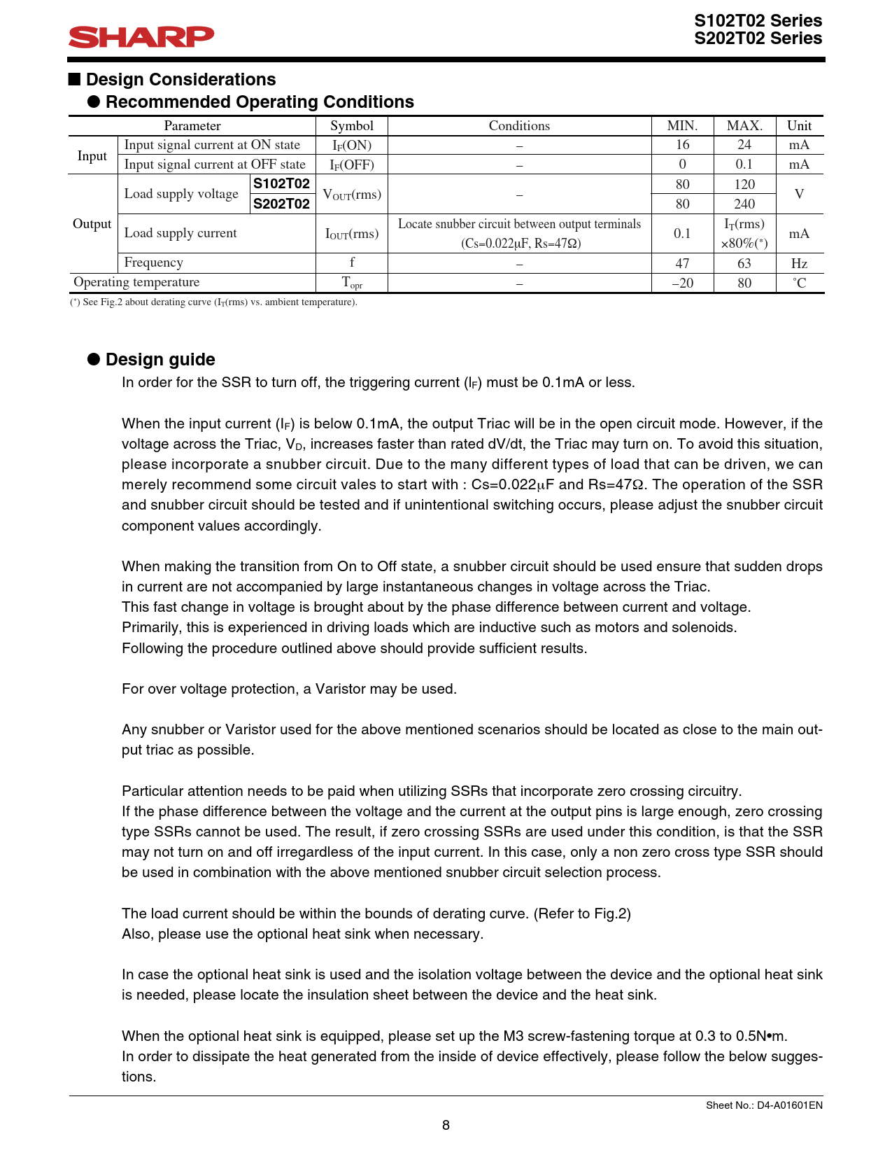 S102T02 Series S202T02 Series ■ Design Considerations ● Recommended Operating Conditions Parameter Symbol Conditions MIN. MAX. Unit Input signal current at ON state IF(ON) − 16 24 mA Input Input signal current at OFF state IF(OFF) − 0 0.1 mA S102T02 80 120 Load supply voltage VOUT(rms) − V S202T02 80 240 Output Locate snubber circuit between output terminals I Load supply current T(rms) IOUT(rms) 0.1 mA (Cs=0.022µF, Rs=47Ω) ×80%(∗) Frequency f − 47 63 Hz Operating temperature Topr − −20 80 ˚C (∗) See Fig.2 about derating curve (IT(rms) vs. ambient temperature). ● Design guide In order for the SSR to turn off, the triggering current (lF) must be 0.1mA or less. When the input current (IF) is below 0.1mA, the output Triac will be in the open circuit mode. However, if the voltage across the Triac, VD, increases faster than rated dV/dt, the Triac may turn on. To avoid this situation, please incorporate a snubber circuit. Due to the many different types of load that can be driven, we can merely recommend some circuit vales to start with : Cs=0.022µF and Rs=47Ω. The operation of the SSR and snubber circuit should be tested and if unintentional switching occurs, please adjust the snubber circuit component values accordingly. When making the transition from On to Off state, a snubber circuit should be used ensure that sudden drops in current are not accompanied by large instantaneous changes in voltage across the Triac. This fast change in voltage is brought about by the phase difference between current and voltage. Primarily, this is experienced in driving loads which are inductive such as motors and solenoids. Following the procedure outlined above should provide sufficient results. For over voltage protection, a Varistor may be used. Any snubber or Varistor used for the above mentioned scenarios should be located as close to the main out- put triac as possible. Particular attention needs to be paid when utilizing SSRs that incorporate zero crossing circuitry. If the phase difference between the voltage and the current at the output pins is large enough, zero crossing type SSRs cannot be used. The result, if zero crossing SSRs are used under this condition, is that the SSR may not turn on and off irregardless of the input current. In this case, only a non zero cross type SSR should be used in combination with the above mentioned snubber circuit selection process. The load current should be within the bounds of derating curve. (Refer to Fig.2) Also, please use the optional heat sink when necessary. In case the optional heat sink is used and the isolation voltage between the device and the optional heat sink is needed, please locate the insulation sheet between the device and the heat sink. When the optional heat sink is equipped, please set up the M3 screw-fastening torque at 0.3 to 0.5N•m. In order to dissipate the heat generated from the inside of device effectively, please follow the below sugges- tions. Sheet No.: D4-A01601EN 8