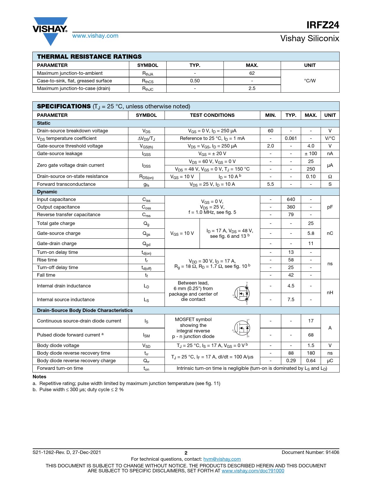IRFZ24 www.vishay.com Vishay Siliconix THERMAL RESISTANCE RATINGS PARAMETER SYMBOLTYP.MAX.UNIT Maximum junction-to-ambient RthJA - 62 Case-to-sink, flat, greased surface RthCS 0.50 - °C/W Maximum junction-to-case (drain) RthJC - 2.5 SPECIFICATIONS (TJ = 25 °C, unless otherwise noted) PARAMETER SYMBOLTESTCONDITIONSMIN.TYP.MAX.UNITStatic Drain-source breakdown voltage VDS VGS = 0 V, ID = 250 μA 60 - - V VDS temperature coefficient ΔVDS/TJ Reference to 25 °C, ID = 1 mA - 0.061 - V/°C Gate-source threshold voltage VGS(th) VDS = VGS, ID = 250 μA 2.0 - 4.0 V Gate-source leakage IGSS VGS = ± 20 V - - ± 100 nA VDS = 60 V, VGS = 0 V - - 25 Zero gate voltage drain current IDSS μA VDS = 48 V, VGS = 0 V, TJ = 150 °C - - 250 Drain-source on-state resistance RDS(on) VGS = 10 V ID = 10 A b - - 0.10 Ω Forward transconductance gfs VDS = 25 V, ID = 10 A 5.5 - - S Dynamic Input capacitance Ciss V - 640 - GS = 0 V, Output capacitance Coss VDS = 25 V, - 360 - pF f = 1.0 MHz, see fig. 5 Reverse transfer capacitance Crss - 79 - Total gate charge Qg - - 25 I Gate-source charge Qgs V D = 17 A, VDS = 48 V, GS = 10 V - - 5.8 nC see fig. 6 and 13 b Gate-drain charge Qgd - - 11 Turn-on delay time td(on) - 13 - Rise time tr V - 58 - DD = 30 V, ID = 17 A, ns R Turn-off delay time t g = 18 Ω, RD = 1.7 Ω, see fig. 10 b d(off) - 25 - Fall time tf - 42 - Between lead, D Internal drain inductance LD - 4.5 - 6 mm (0.25") from package and center of nH G Internal source inductance L die contact S - 7.5 - S Drain-Source Body Diode Characteristics Continuous source-drain diode current I MOSFET symbol D S - - 17 showing the A integral reverse G Pulsed diode forward current a ISM p - n junction diode S - - 68 Body diode voltage VSD TJ = 25 °C, IS = 17 A, VGS = 0 V b - - 1.5 V Body diode reverse recovery time trr - 88 180 ns TJ = 25 °C, IF = 17 A, dI/dt = 100 A/μs Body diode reverse recovery charge Qrr - 0.29 0.64 μC Forward turn-on time ton Intrinsic turn-on time is negligible (turn-on is dominated by LS and LD) Notes a. Repetitive rating; pulse width limited by maximum junction temperature (see fig. 11) b. Pulse width ≤ 300 μs; duty cycle ≤ 2 % S21-1262-Rev. D, 27-Dec-2021 2 Document Number: 91406 For technical questions, contact: hvm@vishay.com THIS DOCUMENT IS SUBJECT TO CHANGE WITHOUT NOTICE. THE PRODUCTS DESCRIBED HEREIN AND THIS DOCUMENT ARE SUBJECT TO SPECIFIC DISCLAIMERS, SET FORTH AT www.vishay.com/doc?91000