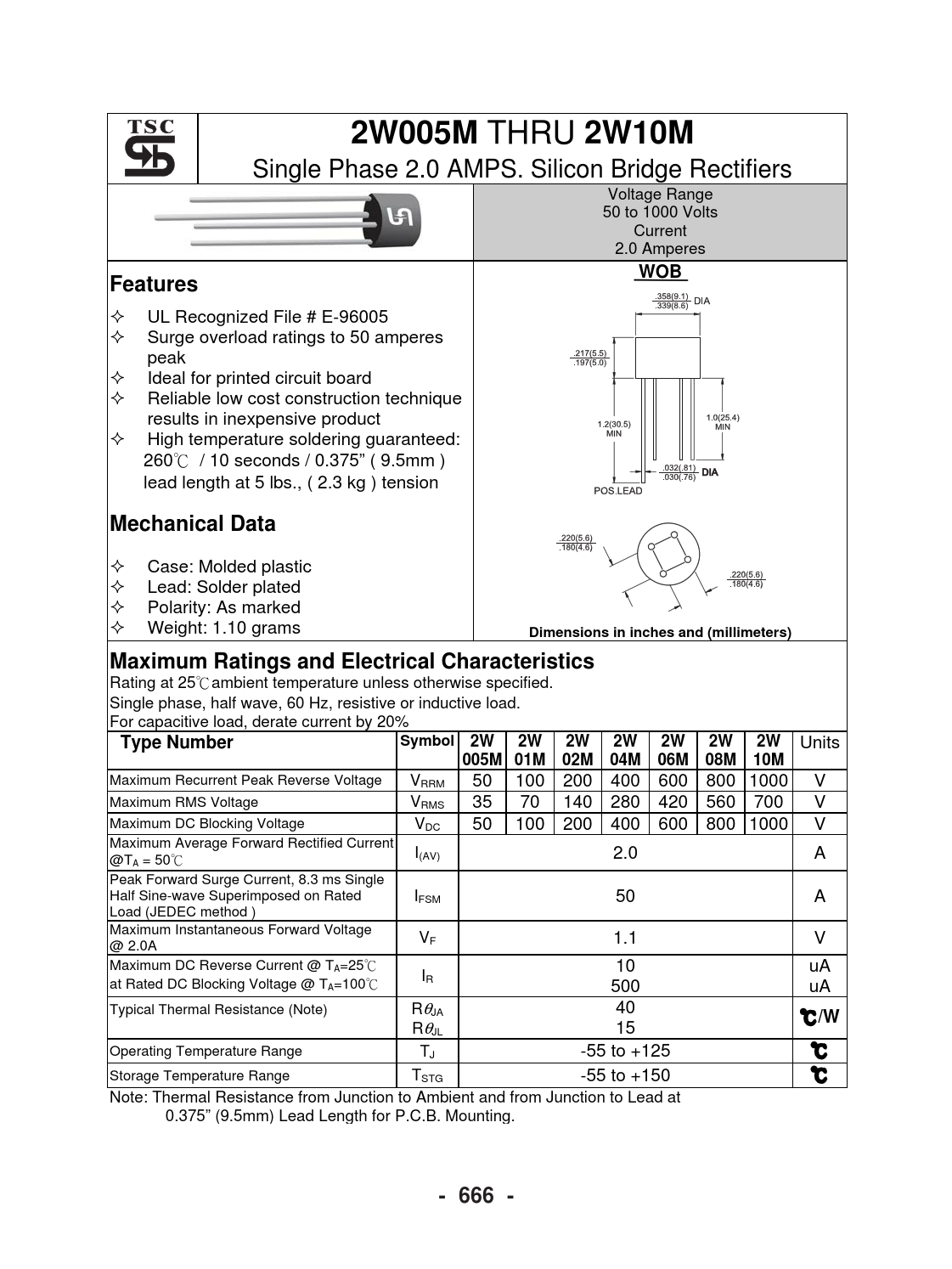 2W005M. 2W10M. WOB. Features. Mechanical Data. Dimensions in inches and (millimeters)