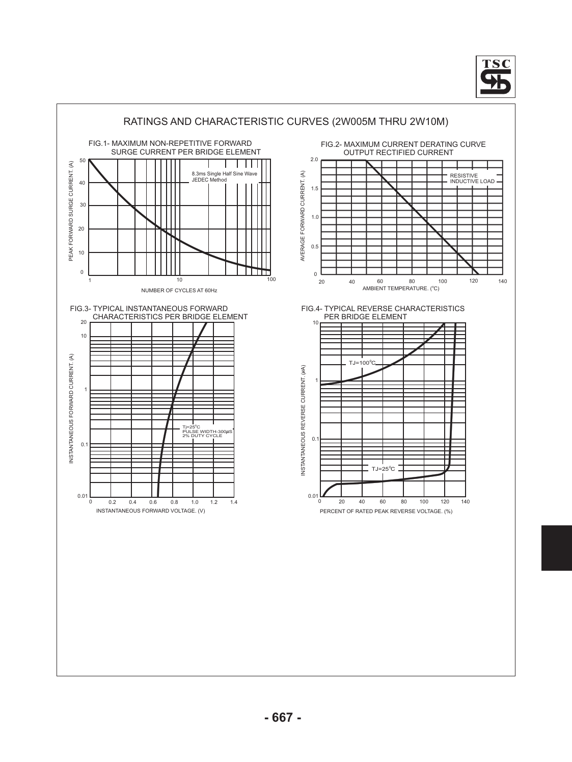 RATINGS AND CHARACTERISTIC CURVES (2W005M THRU 2W10M) FIG.1- MAXIMUM NON-REPETITIVE FORWARD FIG.2- MAXIMUM CURRENT DERATING CURVE SURGE CURRENT PER BRIDGE ELEMENT OUTPUT RECTIFIED CURRENT 50 2.0 (A) . 8.3ms Single Half Sine Wave (A) RESISTIVE JEDEC Method . 40 INDUCTIVE LOAD 1.5 CURRENT 30 CURRENT SURGE ARD 1.0 W ARD 20 W FOR FOR 0.5 10 VERAGE PEAK A 0 0 1 10 100 20 40 60 80 100 120 140 o NUMBER OF CYCLES AT 60Hz AMBIENT TEMPERATURE. ( C) FIG.3- TYPICAL INSTANTANEOUS FORWARD FIG.4- TYPICAL REVERSE CHARACTERISTICS CHARACTERISTICS PER BRIDGE ELEMENT PER BRIDGE ELEMENT 20 10 10 (A) . ) TJ=100 C 0 A .( 1 CURRENT 1 ARD CURRENT W FOR Tj=250C REVERSE PULSE WIDTH-300 S 2% DUTY CYCLE 0.1 ANEOUS 0.1 ANT ANEOUS INST ANT TJ=25 C 0 INST 0.01 0.01 0 0.2 0.4 0.6 0.8 1.0 1.2 1.4 0 20 40 60 80 100 120 140 INSTANTANEOUS FORWARD VOLTAGE. (V) PERCENT OF RATED PEAK REVERSE VOLTAGE. (%)