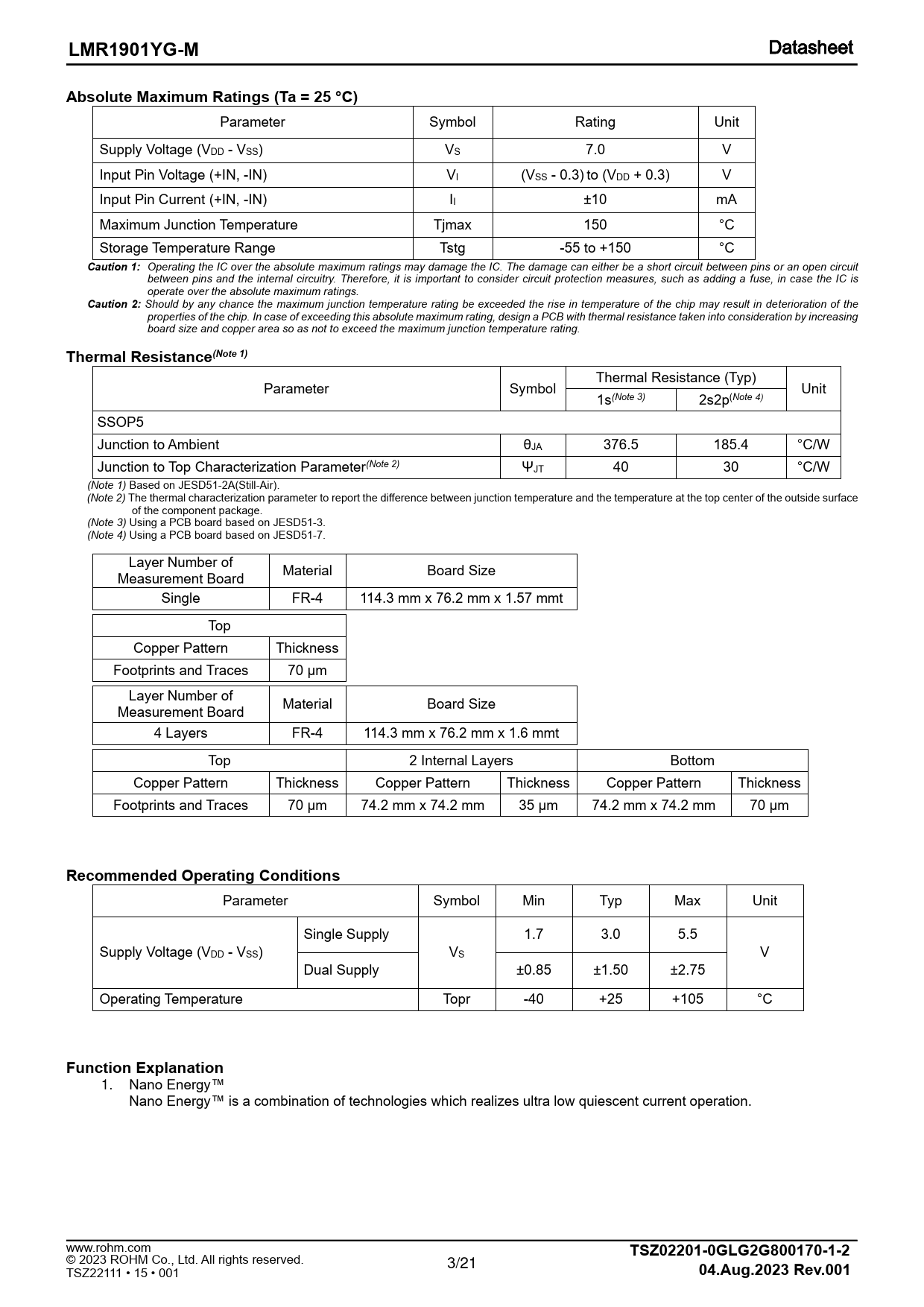 LMR1901YG-M. Absolute Maximum Ratings (Ta = 25 °C). Caution 1:. Caution 2:. Thermal Resistance(Note 1)