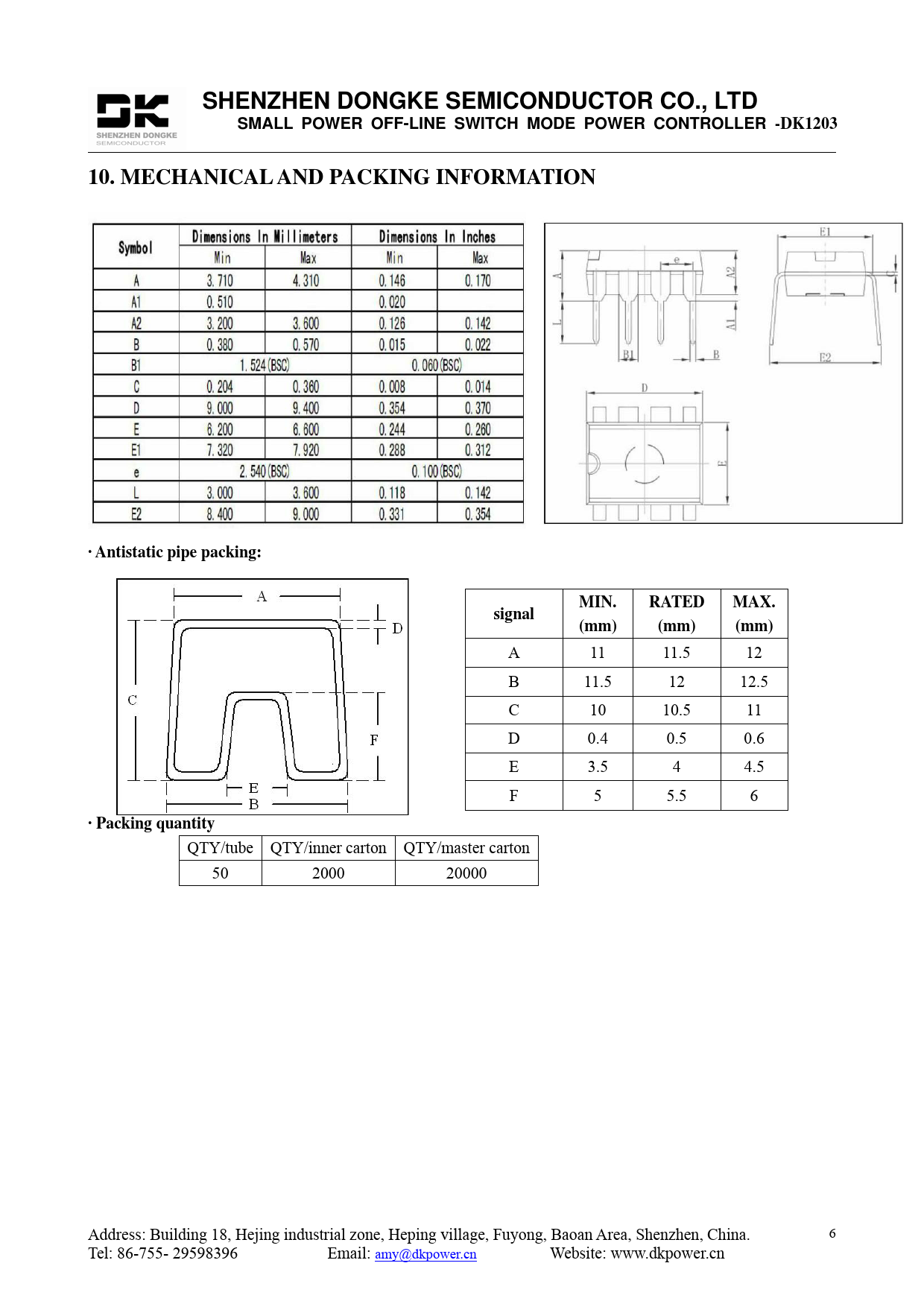 SHENZHEN DONGKE SEMICONDUCTOR CO., LTD SMALL POWER OFF-LINE SWITCH MODE POWER CONTROLLER -DK1203 10. MECHANICAL AND PACKING INFORMATION · Antistatic pipe packing: MIN. RATED MAX. signal (mm) (mm) (mm)