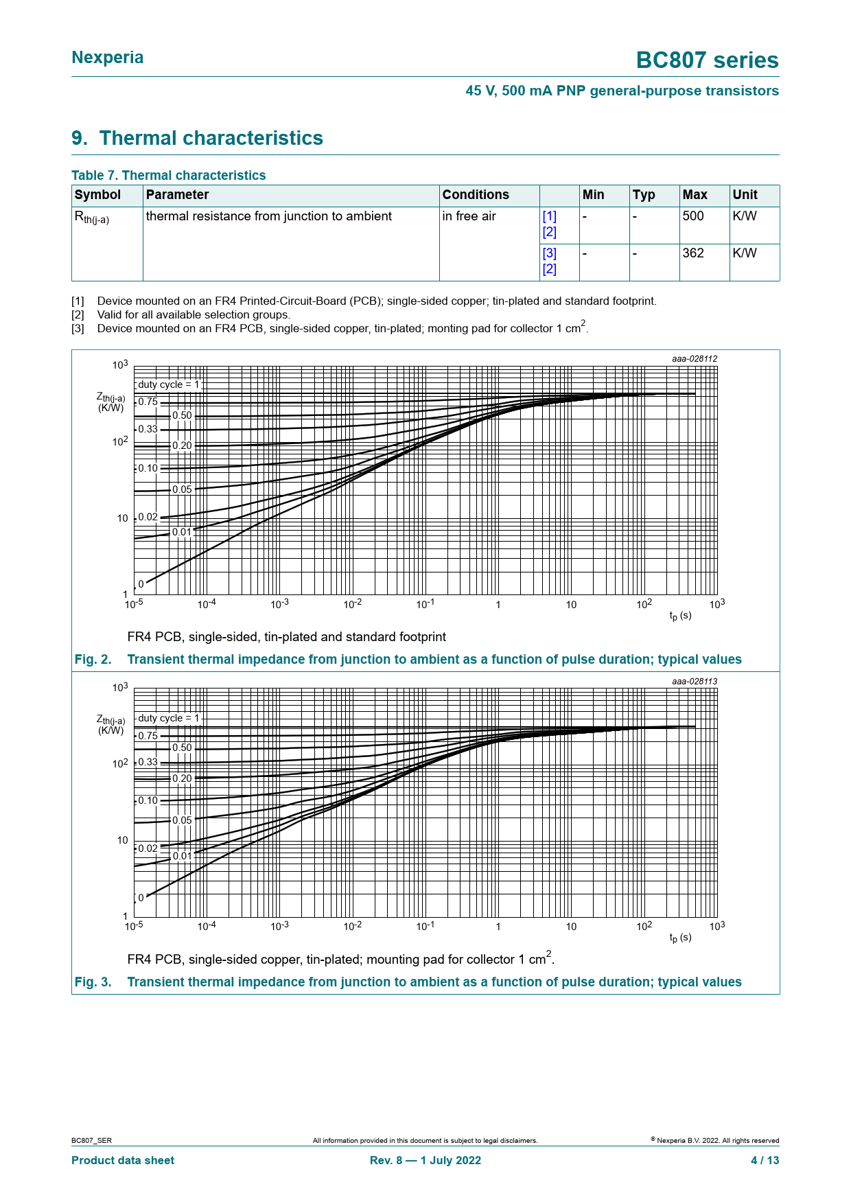 Nexperia BC807 series 45 V, 500 mA PNP general-purpose transistors 9. Thermal characteristics Table 7. Thermal characteristics Symbol Parameter Conditions Min Typ Max Unit