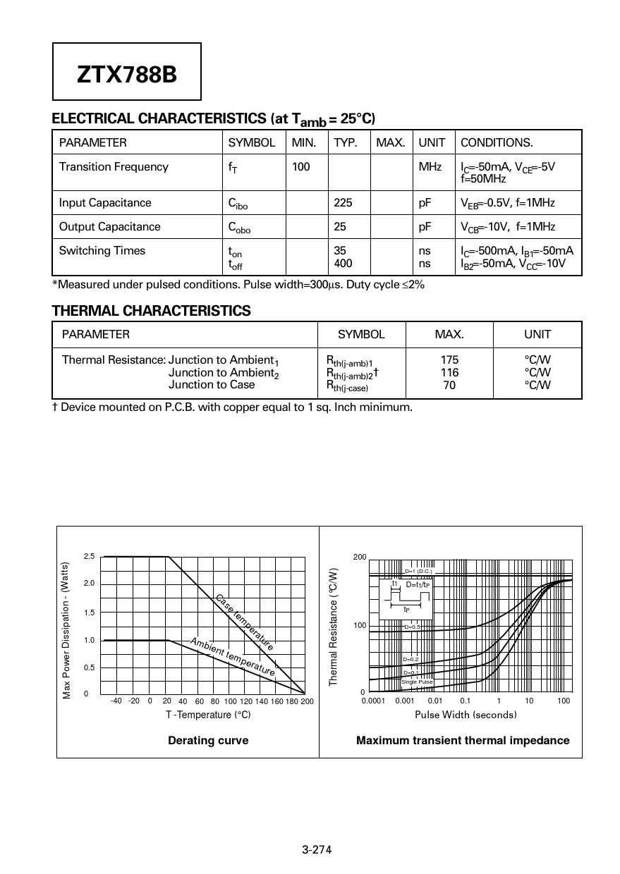 Saturation Voltage Base-Emitter VBE(on) -0.75 V IC=-1A, VCE=-2V* Turn-On Voltage Static Forward Current hFE 500 1500 IC=-10mA, VCE=-2V* Transfer Ratio 400 IC=-1A, VCE=-2V* 300 IC=-2A, VCE=-2V* 150 IC=-6A, VCE=-2V* 3-274 3-273