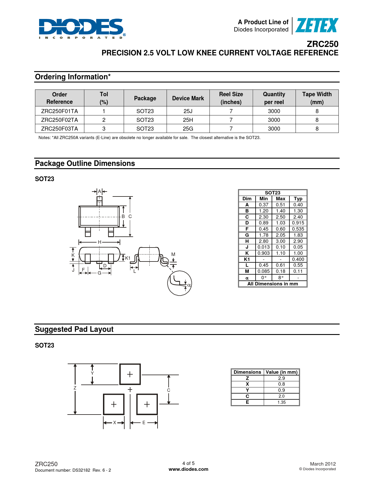 ZRC250F01TA 1 SOT23 25J 7 3000 8 ZRC250F02TA 2 SOT23 25H 7 3000 8 ZRC250F03TA 3 SOT23 25G 7 3000 8 Notes: *All ZRC250A variants (E-Line) are obsolete no longer available for sale. The closest alternative is the SOT23.
