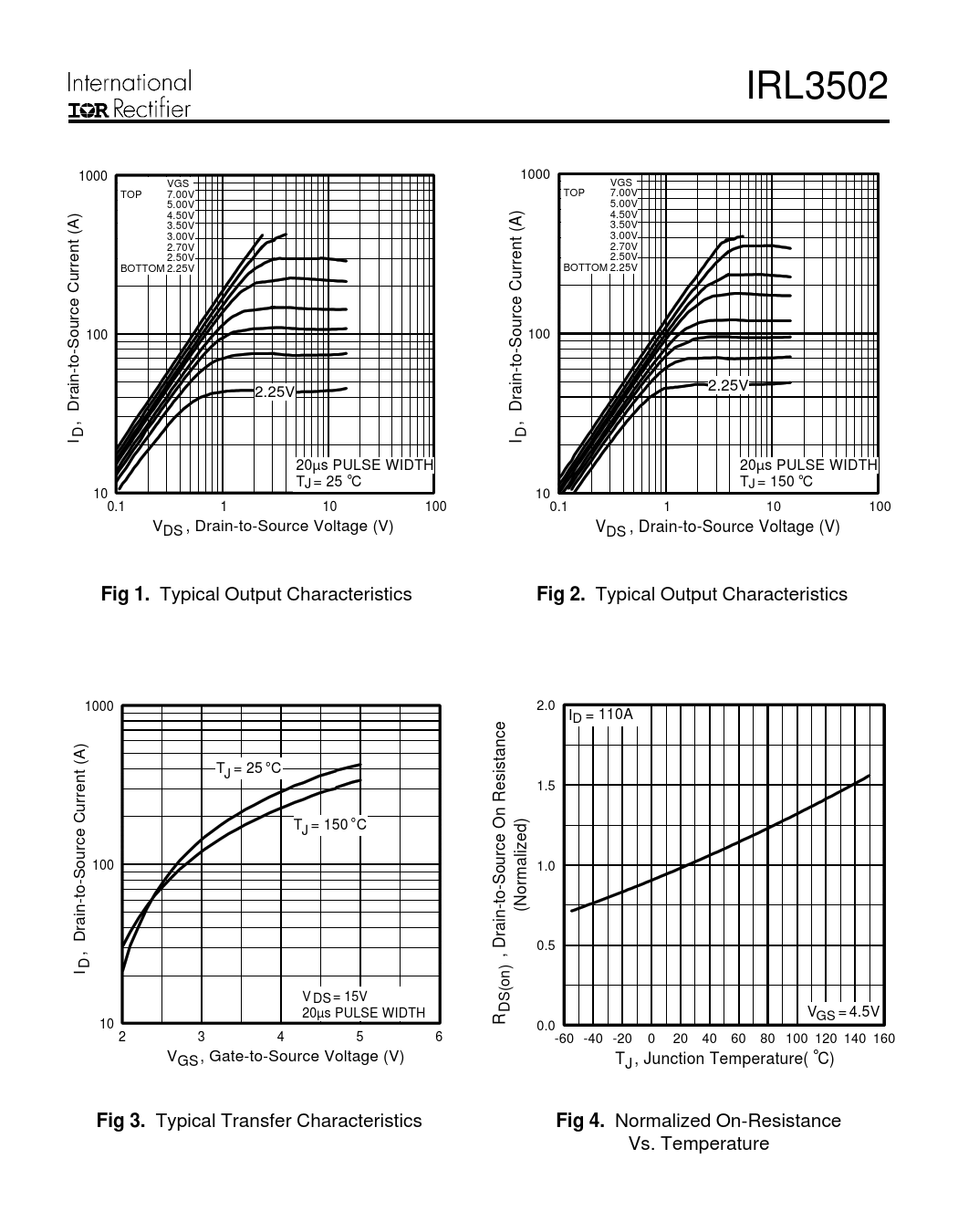 IRL3502 1000 1000 VGS VGS TOP 7.00V TOP 7.00V 5.00V 5.00V 4.50V 4.50V 3.50V 3.50V 3.00V 3.00V 2.70V 2.70V 2.50V 2.50V BOTTOM 2.25V BOTTOM 2.25V 100 100 2.25V 2.25V I , Drain-to-Source Current (A) D I , Drain-to-Source Current (A) D 20µs PULSE WIDTH 20µs PULSE WIDTH T = 25 J °C T = 150 J °C 10 10 0.1 1 10 100 0.1 1 10 100 V , Drain-to-Source Voltage (V) DS V , Drain-to-Source Voltage (V) DS