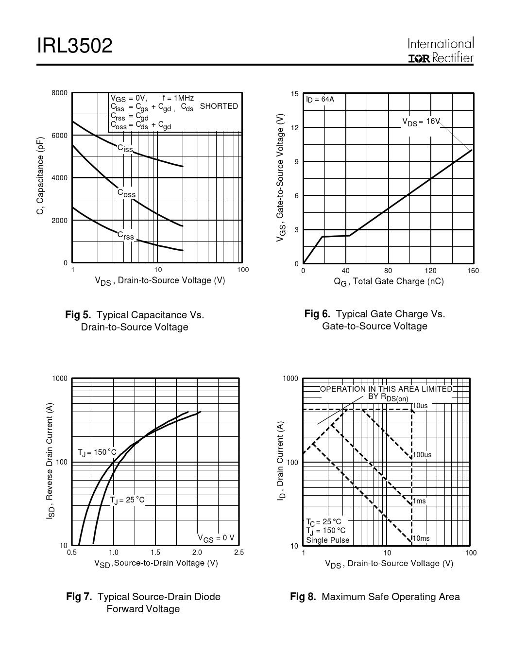 IRL3502 8000 15 VGS = 0V, f = 1MHz ID = 64A C = C + C C SHORTED iss gs gd , ds C = C rss gd C = C + C V = 16V oss ds gd DS 12 6000 Ciss 9 4000 Coss 6 C, Capacitance (pF) 2000 3 Crss GSV , Gate-to-Source Voltage (V) 0 0 1 10 100 0 40 80 120 160 V , Drain-to-Source Voltage (V) DS Q , Total Gate Charge (nC) G Fig 5. Typical Capacitance Vs. Fig 6. Typical Gate Charge Vs. Drain-to-Source Voltage Gate-to-Source Voltage 1000 1000 OPERATION IN THIS AREA LIMITED BY RDS(on) 10us T = 150 C ° J 100us 100 100 D T = 25 C ° I , Drain Current (A) J 1ms I , Reverse Drain Current (A) SD T = 25 C ° C T = 150 C ° J V = 0 V GS Single Pulse 10ms 10 10 0.5 1.0 1.5 2.0 2.5 1 10 100 V ,Source-to-Drain Voltage (V) SD V , Drain-to-Source Voltage (V) DS Fig 7. Typical Source-Drain Diode Fig 8. Maximum Safe Operating Area Forward Voltage