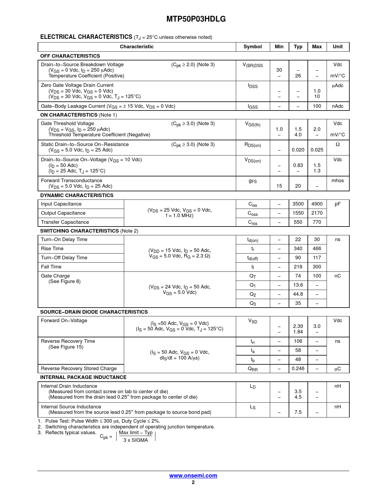 | Páginas / Página | 8 / 2 — MTP50P03HDLG. ELECTRICAL CHARACTERISTICS. Characteristic. Symbol. Min. … |