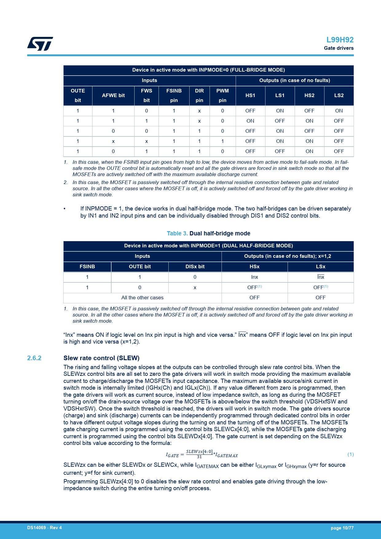 L99H92. Gate drivers. Device in active mode with INPMODE=0 (FULL-BRIDGE MODE). Inputs. Outputs (in case of no faults). OUTE. FWS