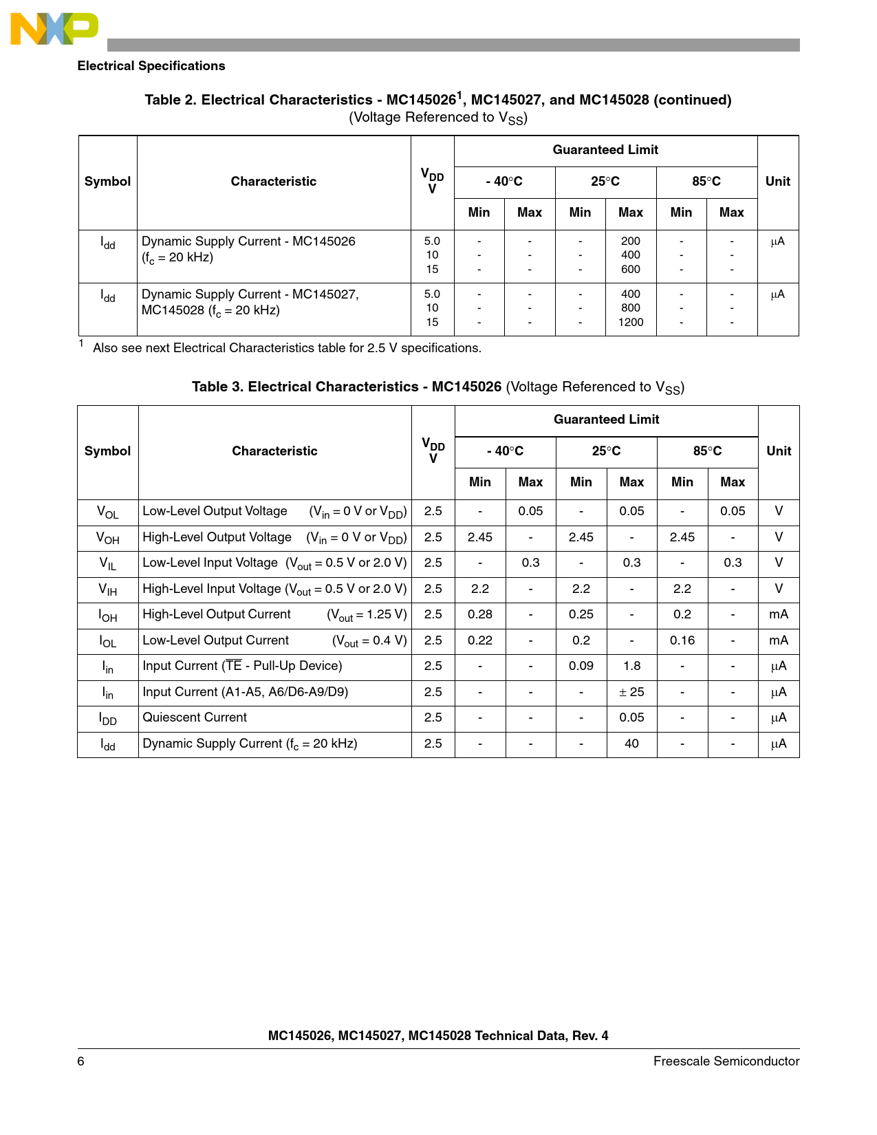 I µ dd Dynamic Supply Current - MC145026 5.0 - - - 200 - - A (f 10 - - - 400 - - c = 20 kHz) 15 - - - 600 - - I µ dd Dynamic Supply Current - MC145027, 5.0 - - - 400 - - A MC145028 (f 10 - - - 800 - - c = 20 kHz) 15 - - - 1200 - - 1 Also see next Electrical Characteristics table for 2.5 V specifications.